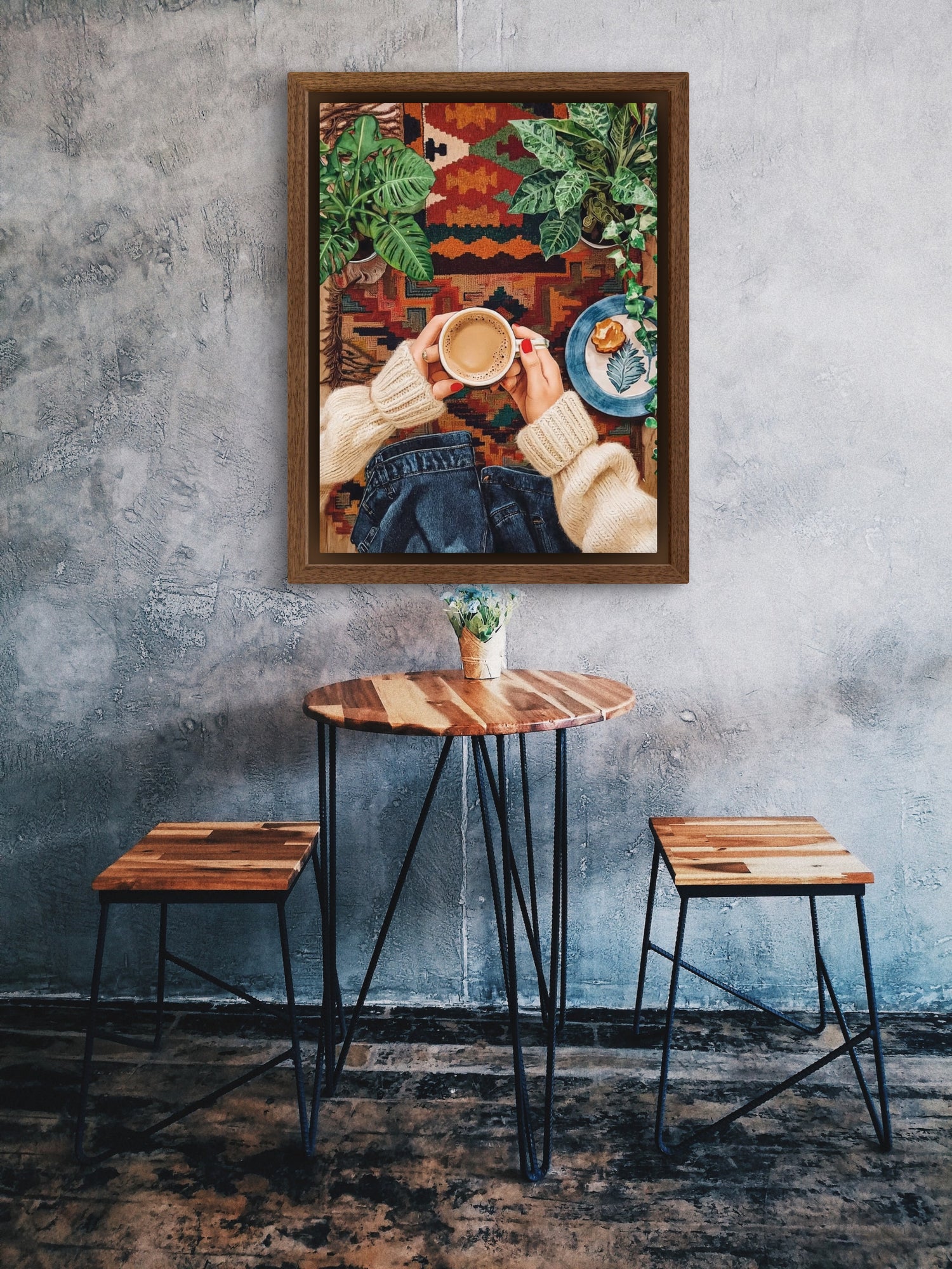 Scenes from cozy home corners — a steaming cup, a woven chair,...