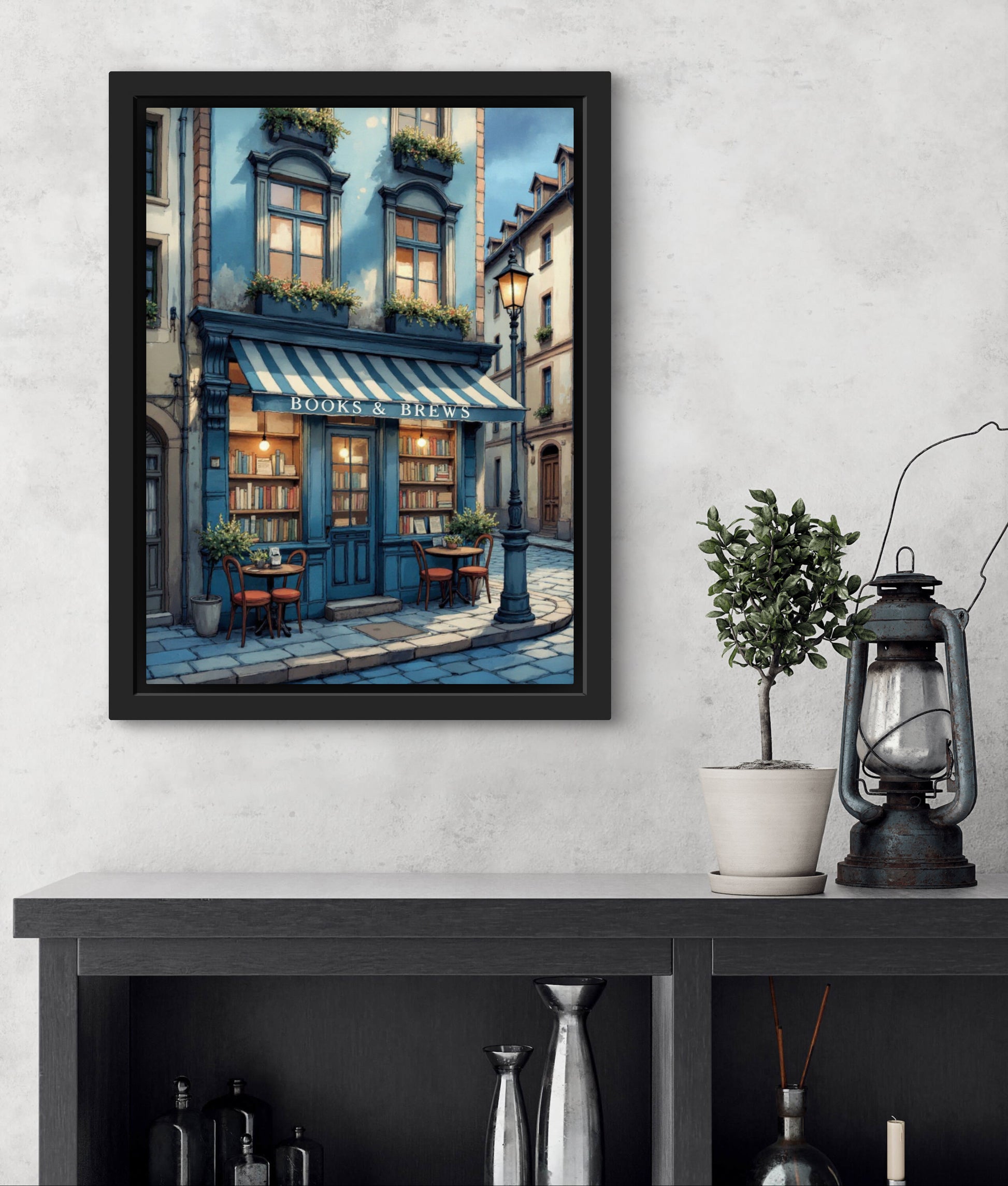 Books & Brews – Cozy Book Café Wall Art Print | European Street Aesthetic