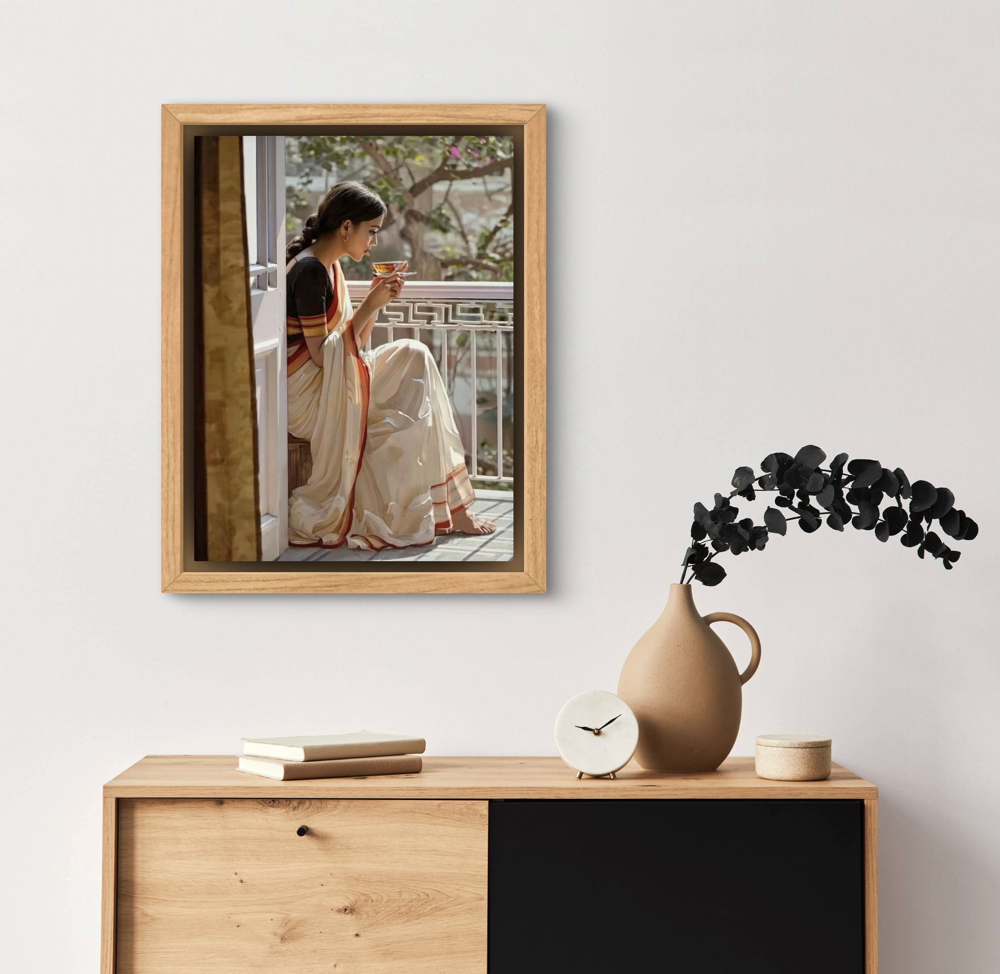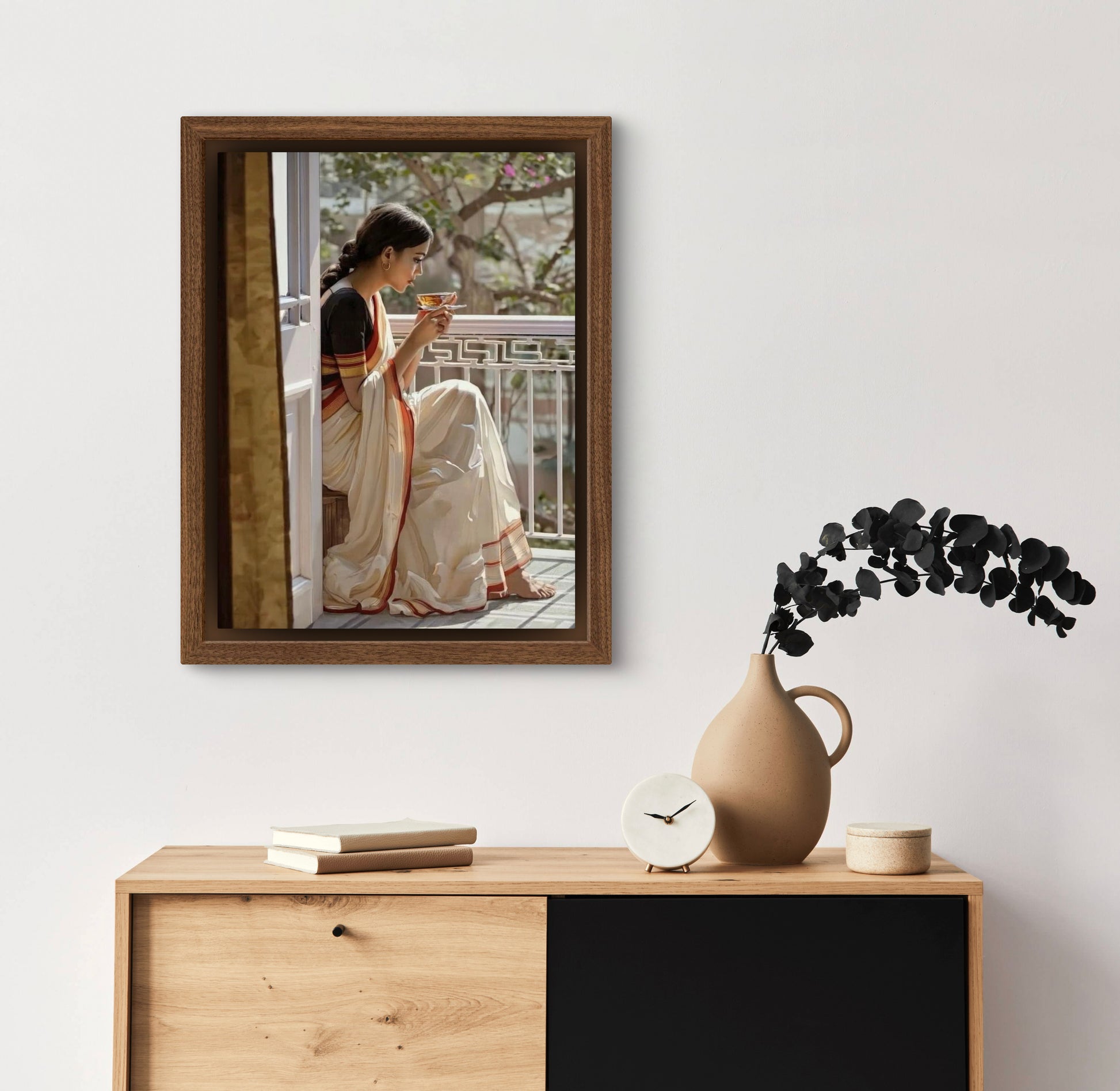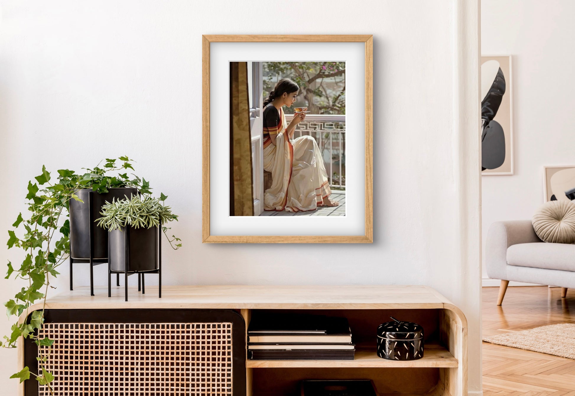 Soft morning light spills over a quiet balcony as a woman sips her chai in contemplative stillness. Chai & Pause is a soulful Indian portrait celebrating grace, ritual, and the beauty of unhurried moments. The warm tones of her saree, paired with her poised profile and serene backdrop, create a piece that feels both nostalgic and timeless.