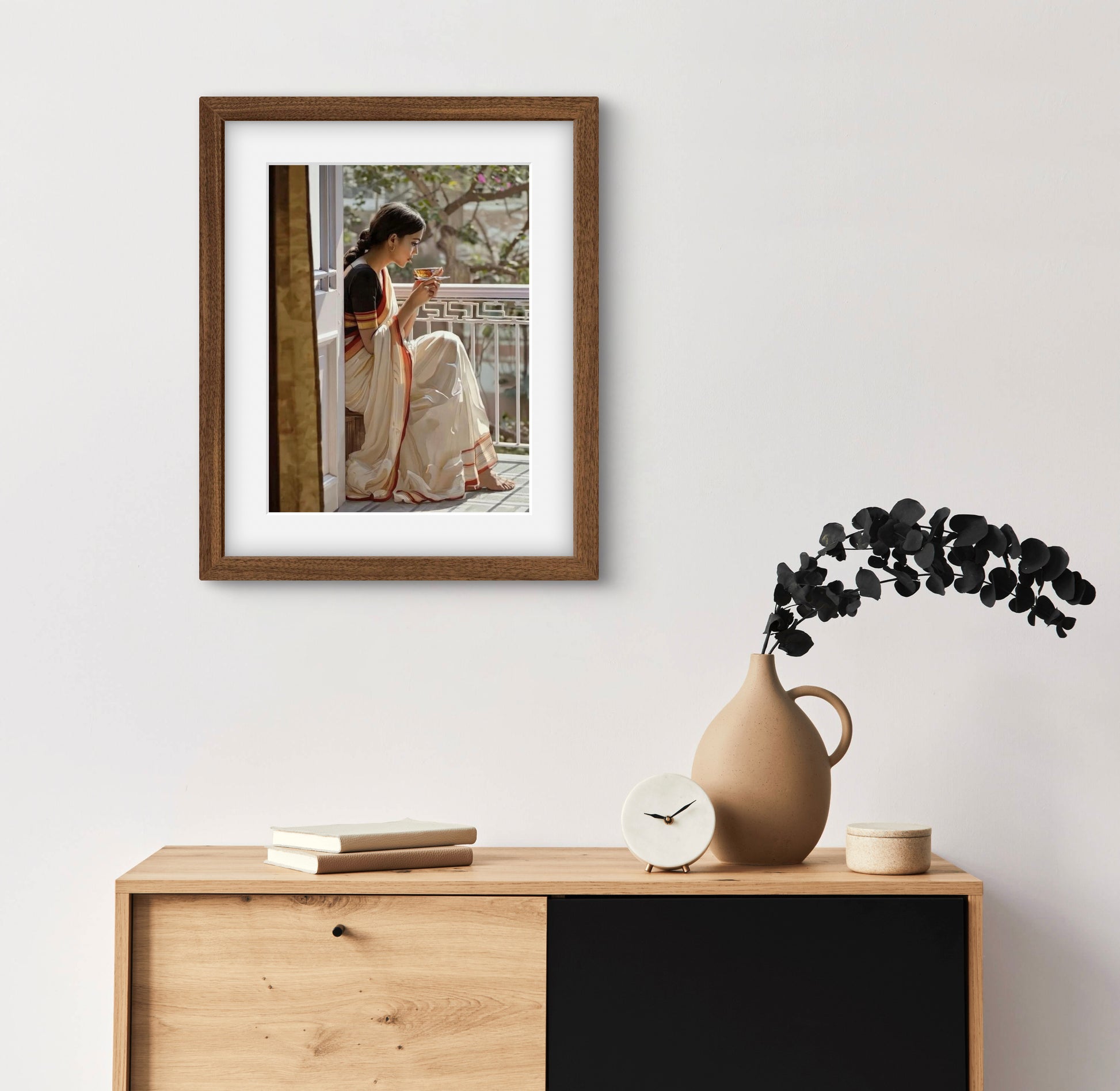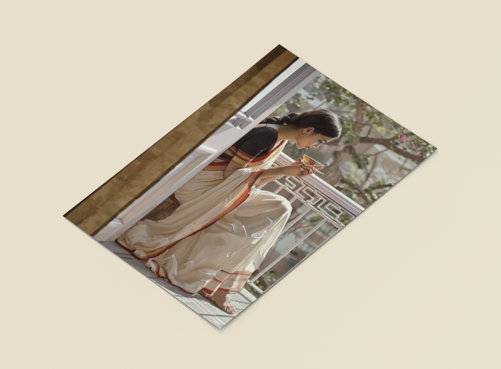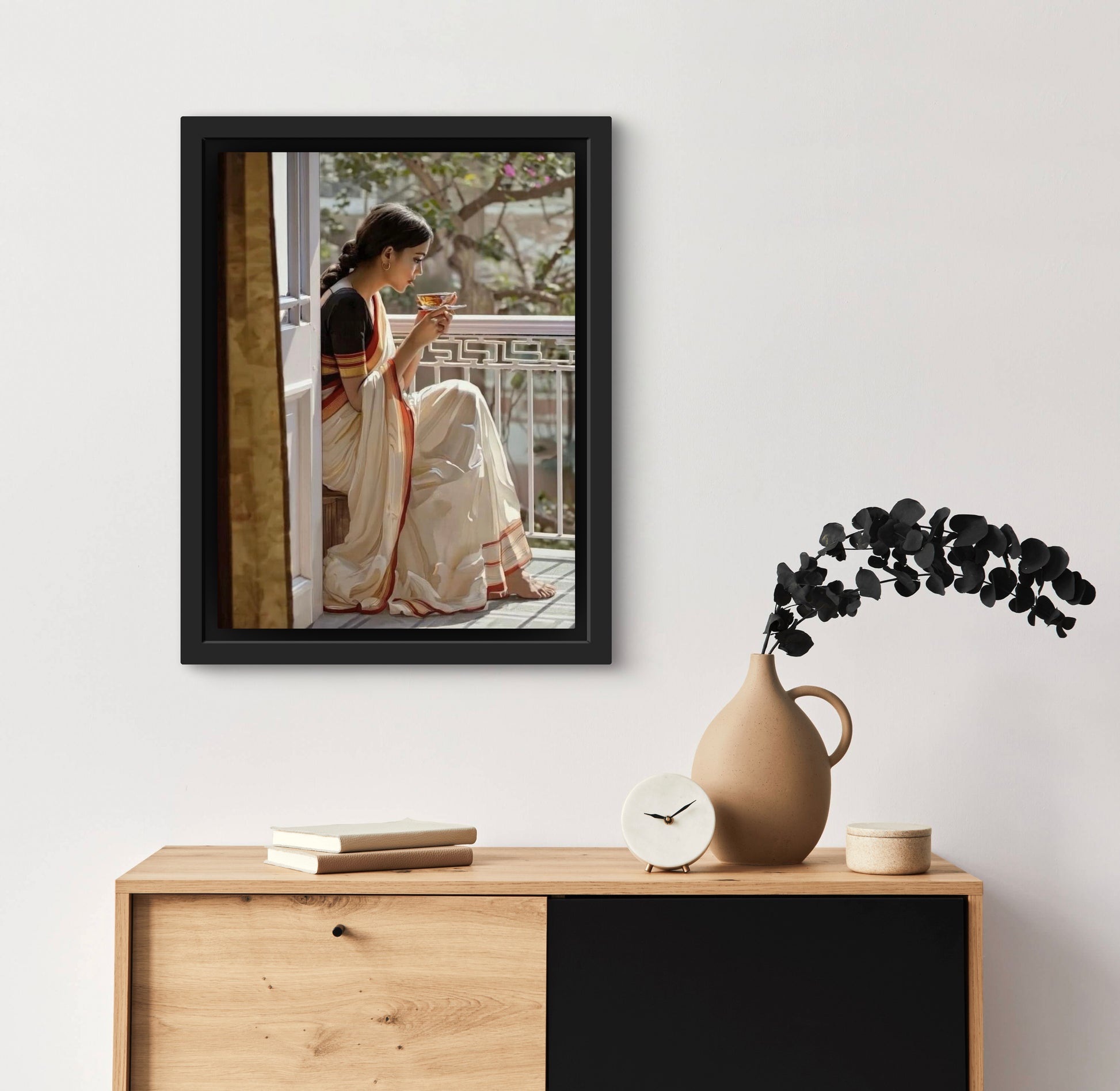 Soft morning light spills over a quiet balcony as a woman sips her chai in contemplative stillness. Chai & Pause is a soulful Indian portrait celebrating grace, ritual, and the beauty of unhurried moments. The warm tones of her saree, paired with her poised profile and serene backdrop, create a piece that feels both nostalgic and timeless.