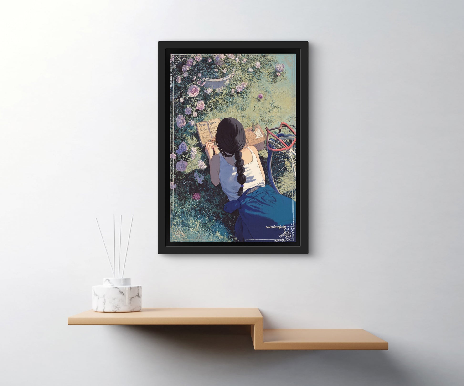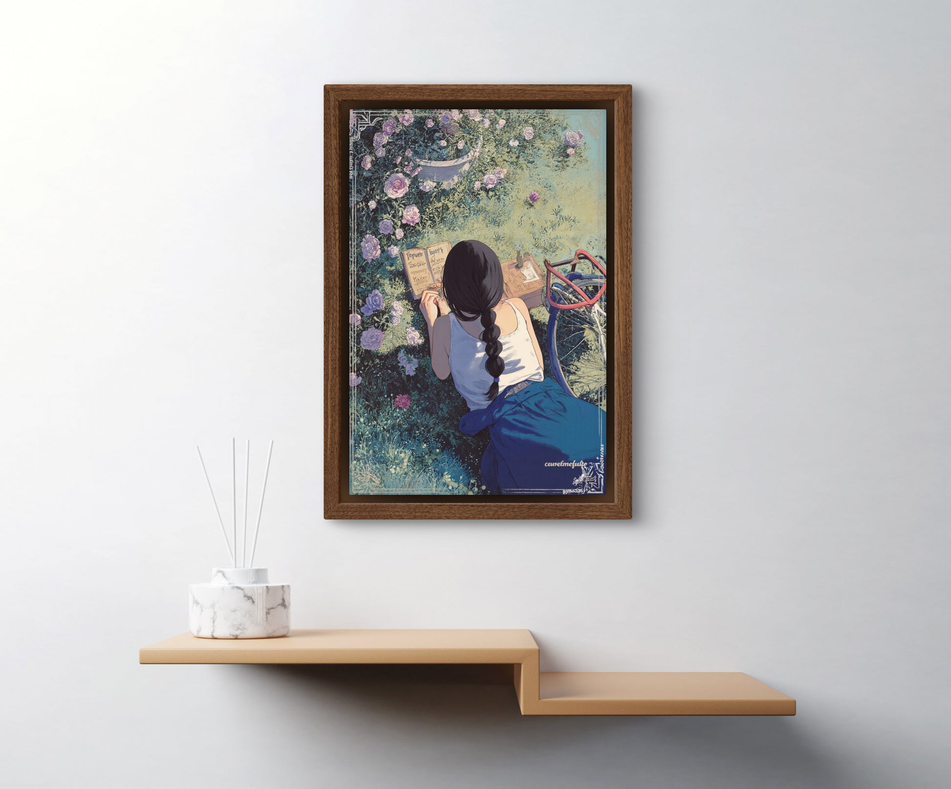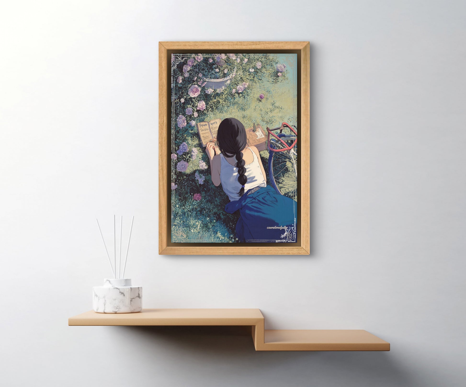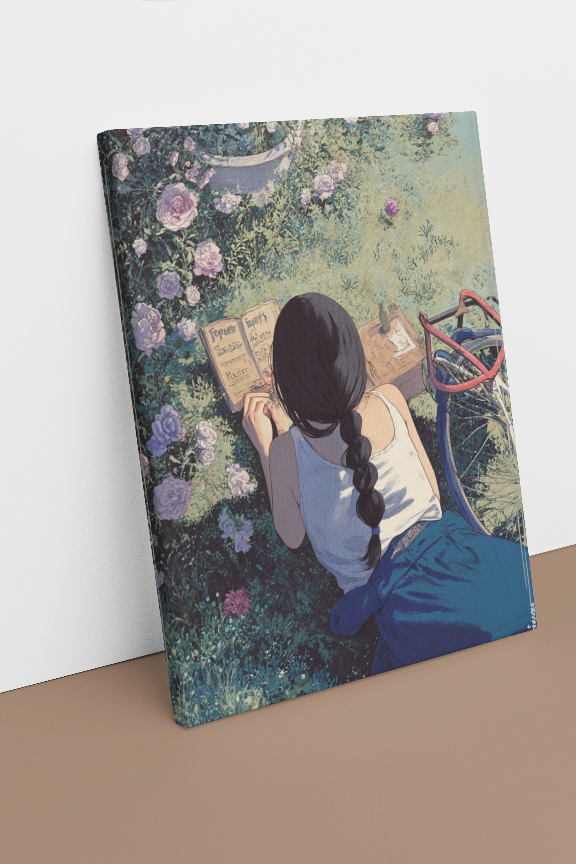 Let your walls bloom with quiet reflection. Folding Inwards captures a tender moment of solitude — a young woman sits in a garden of blooming roses, journaling in the golden afternoon light. Surrounded by petals and peace, this artwork celebrates stillness, self-connection, and the poetry of the everyday.