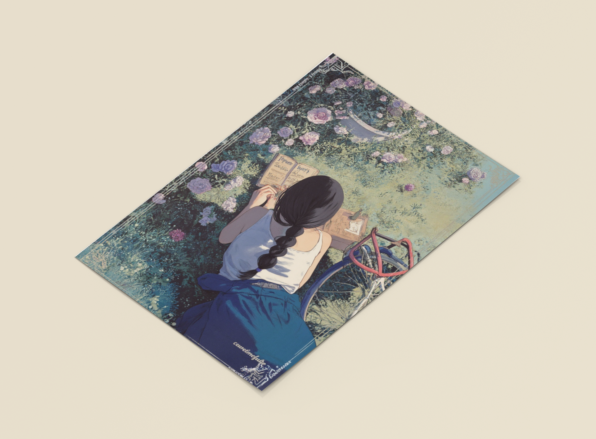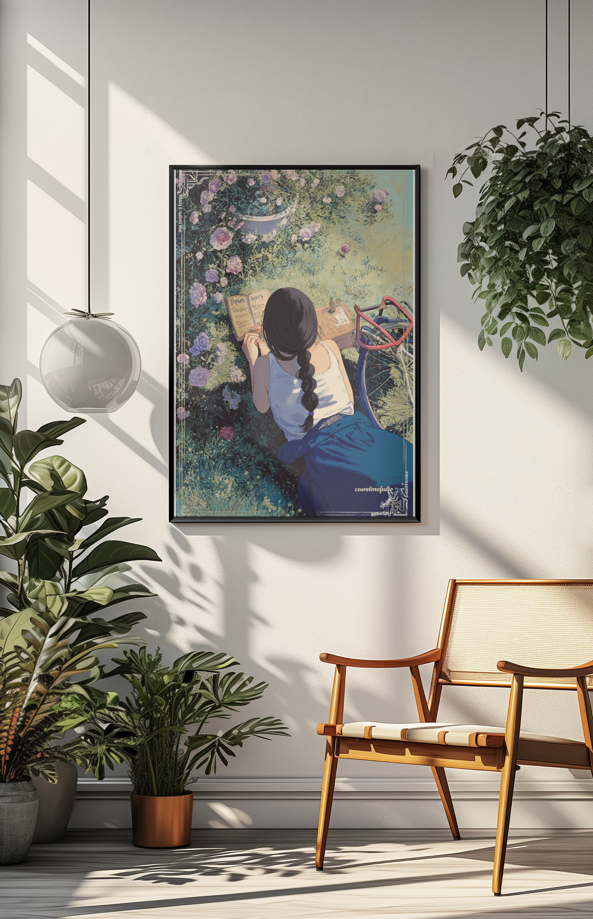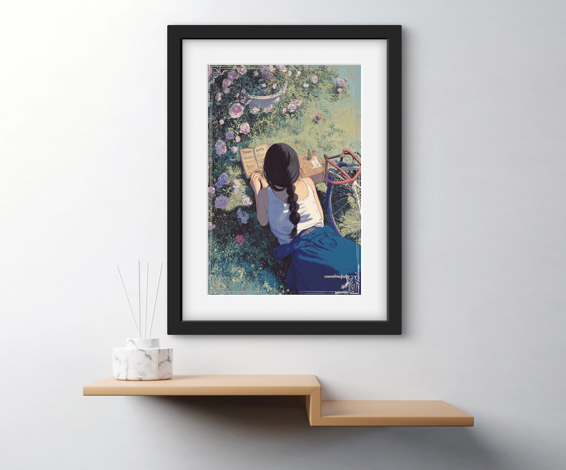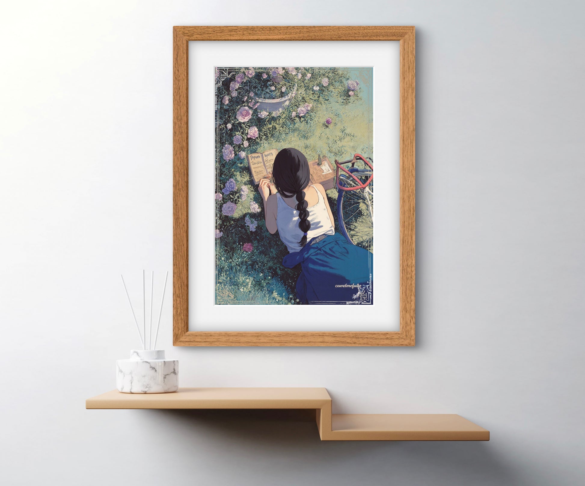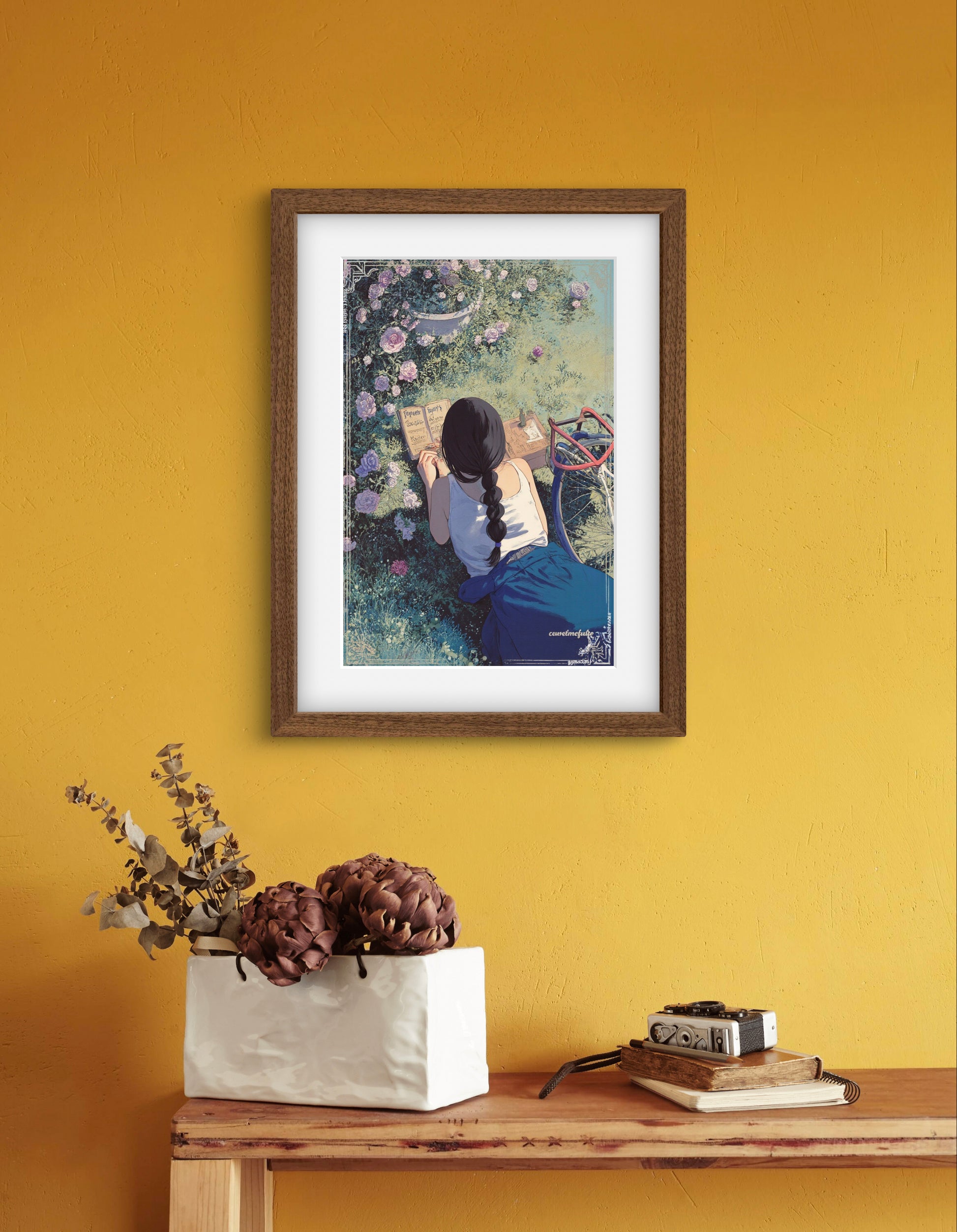 Let your walls bloom with quiet reflection. Folding Inwards captures a tender moment of solitude — a young woman sits in a garden of blooming roses, journaling in the golden afternoon light. Surrounded by petals and peace, this artwork celebrates stillness, self-connection, and the poetry of the everyday.