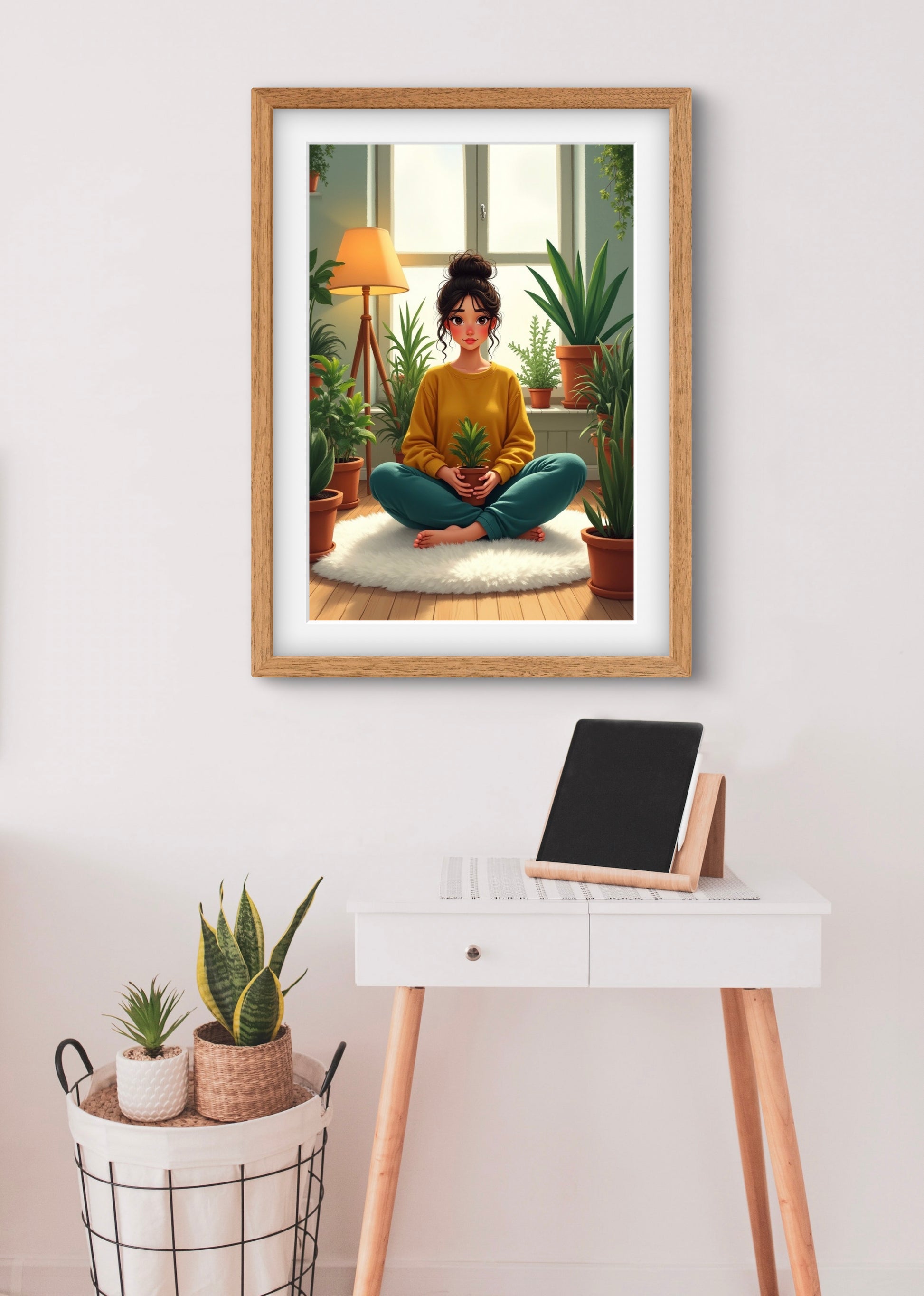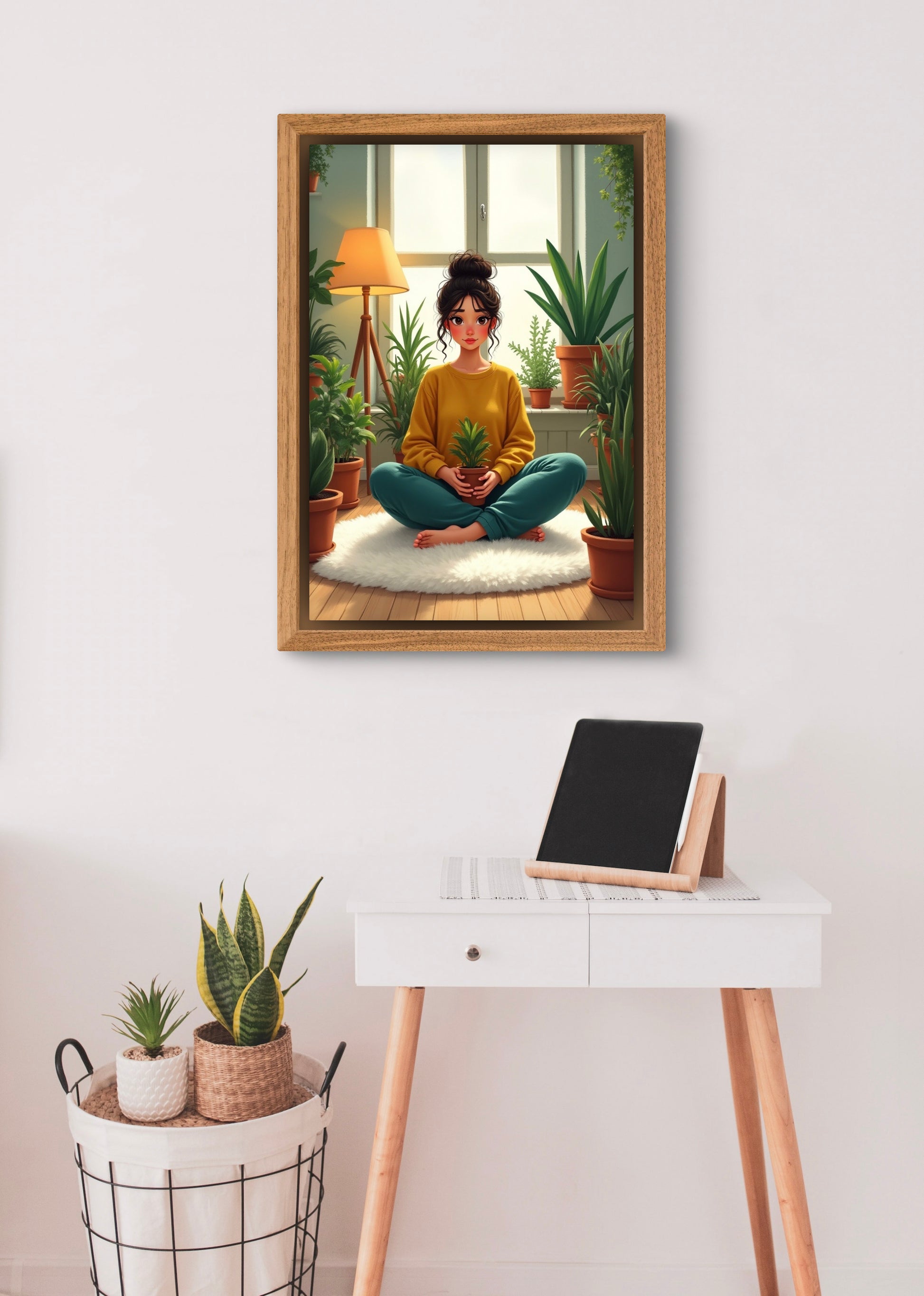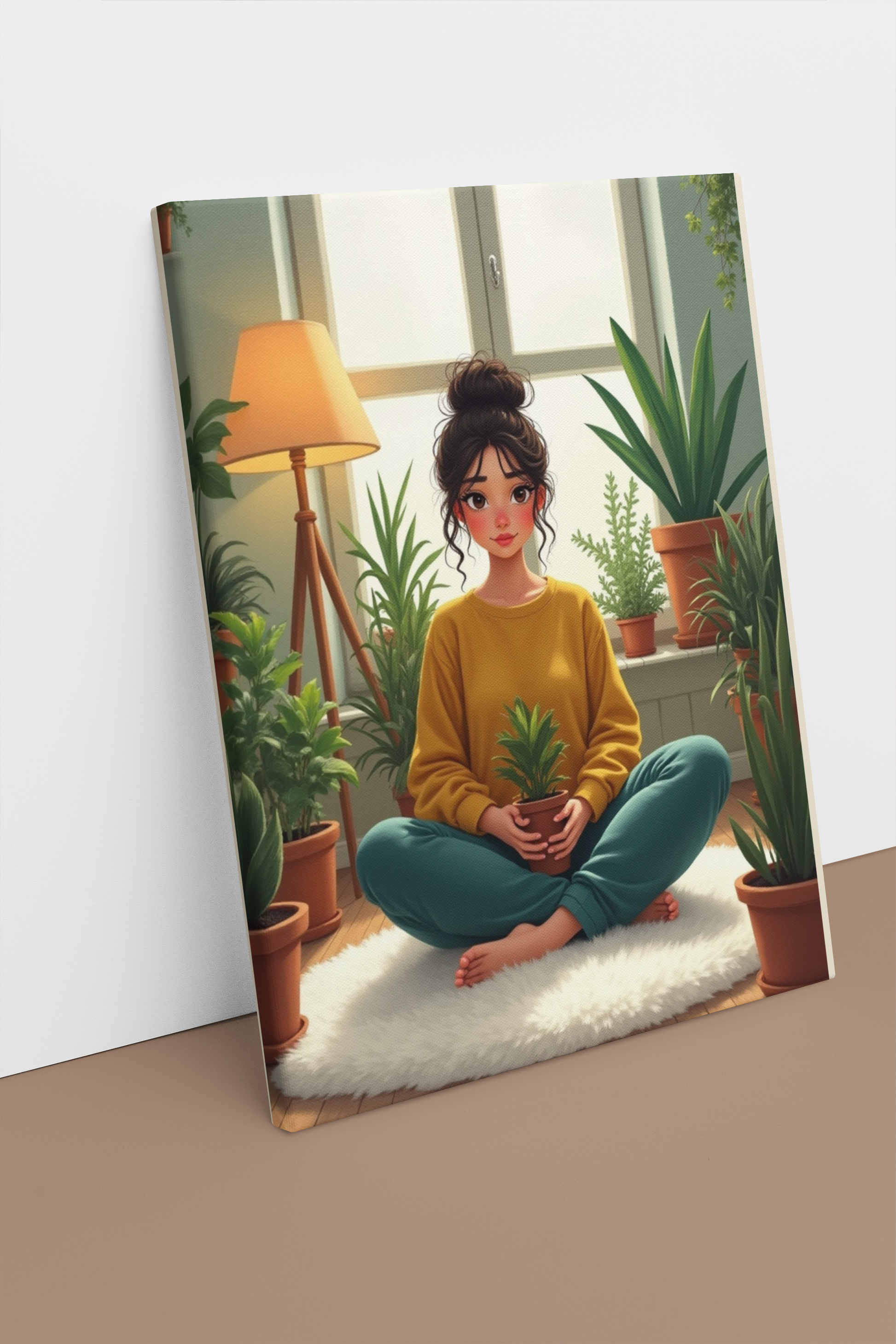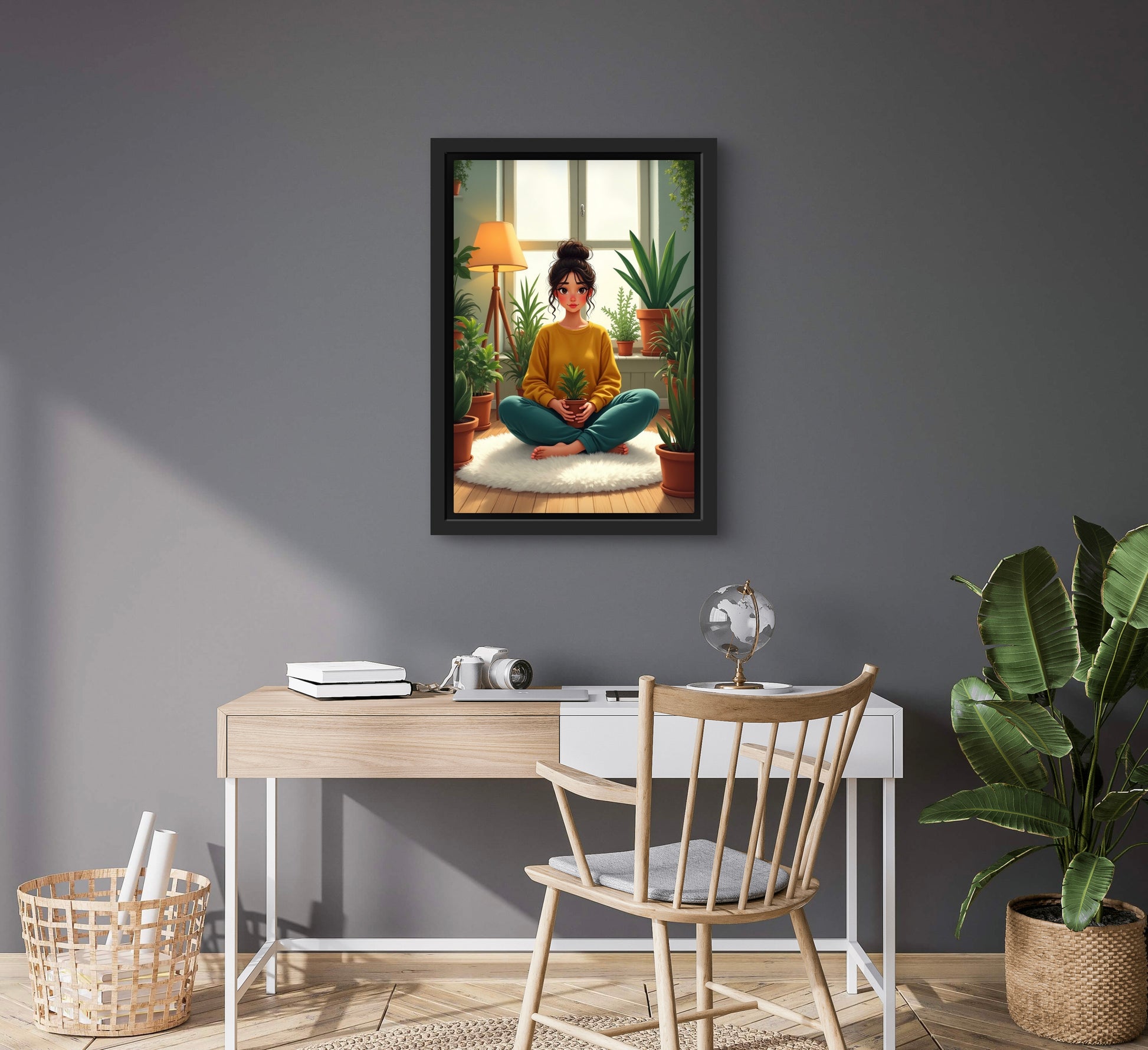 A celebration of stillness, greenery, and gentle connection. Green Companion captures a serene moment — a young woman sitting cross-legged on a soft white rug, cradling a potted plant in her hands. Framed by a sunlit room filled with lush houseplants and warm earthy tones, this artwork invites calm, growth, and grounded energy into your space.