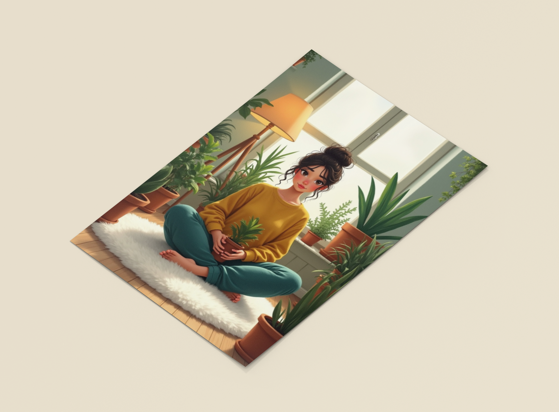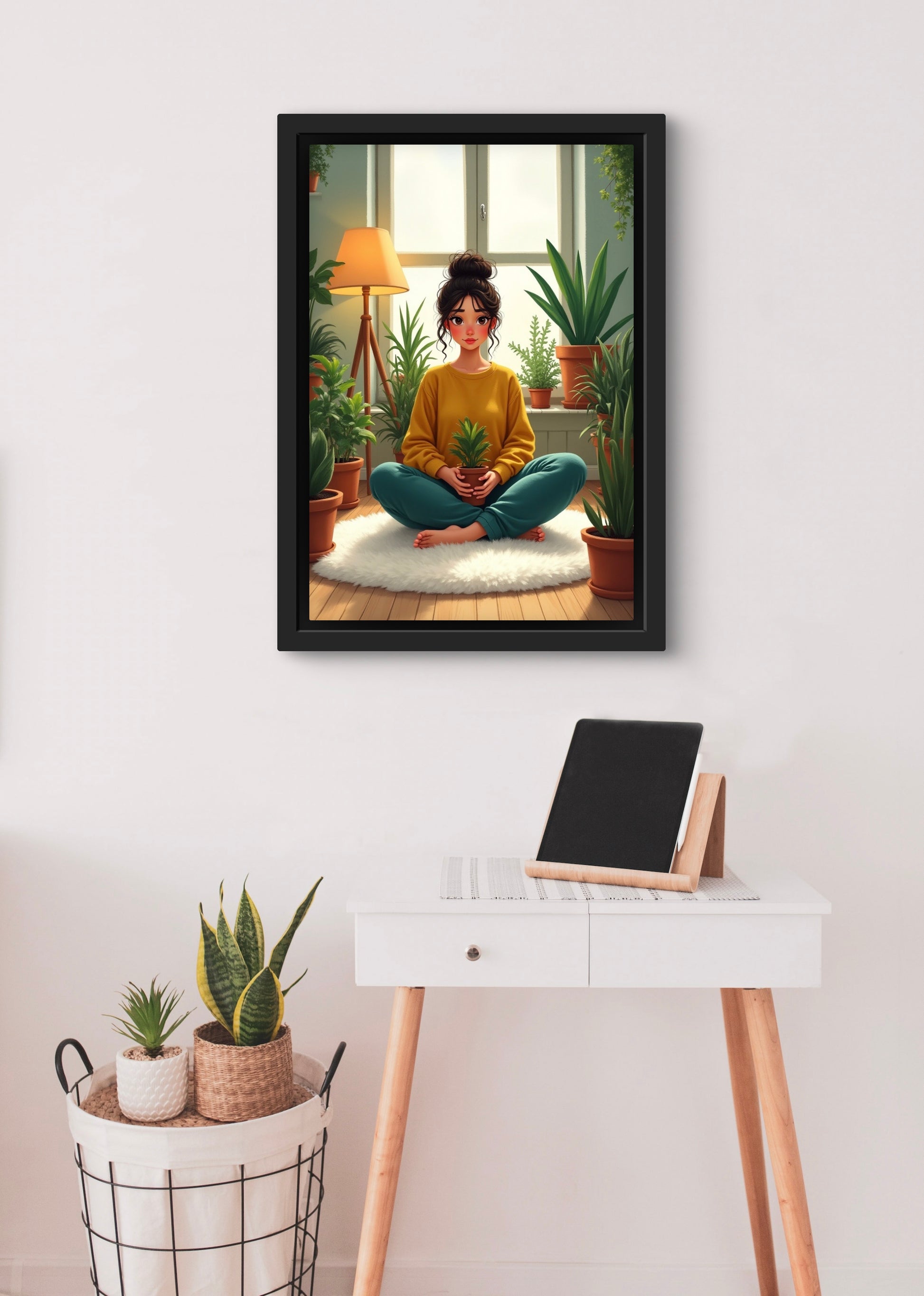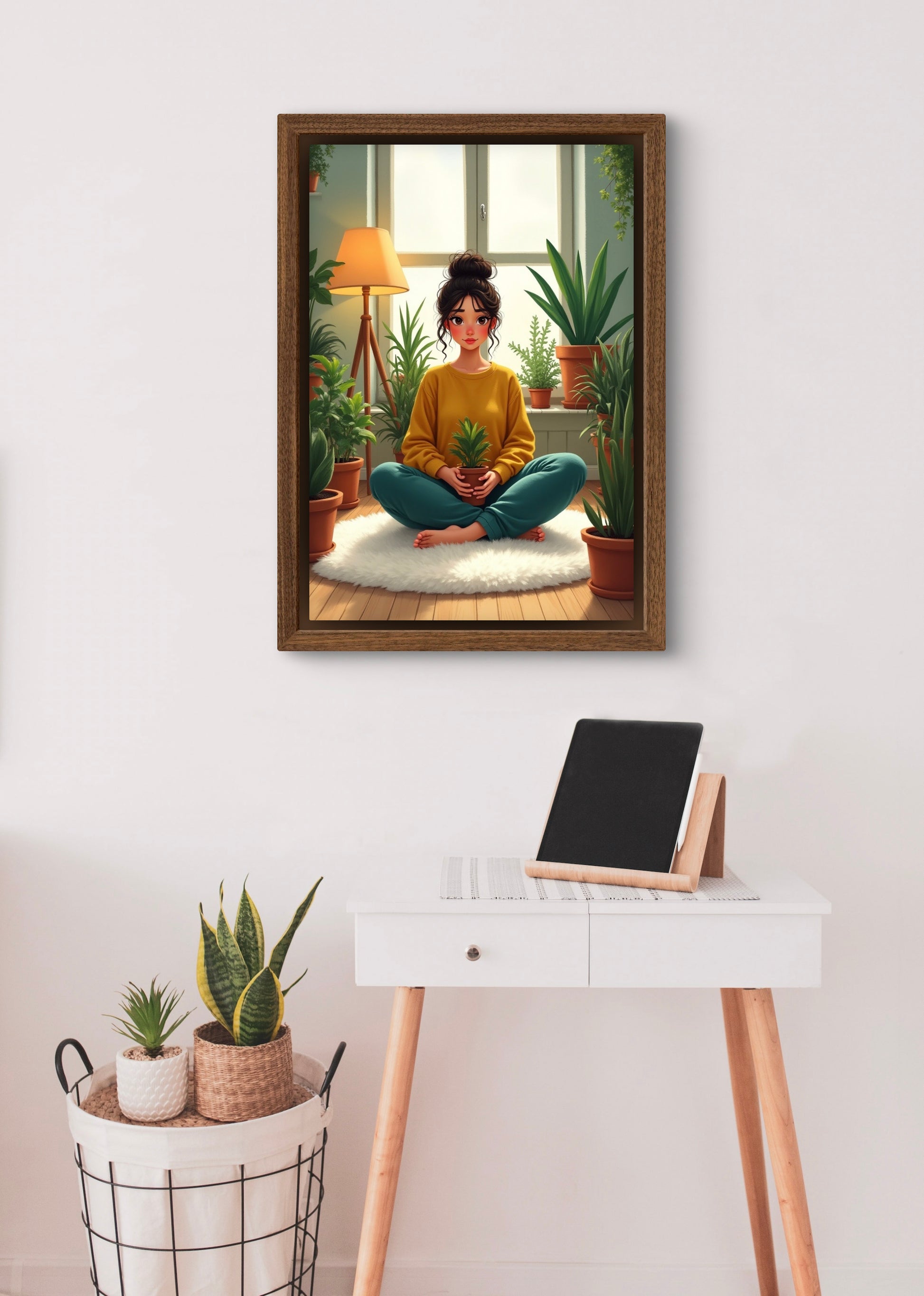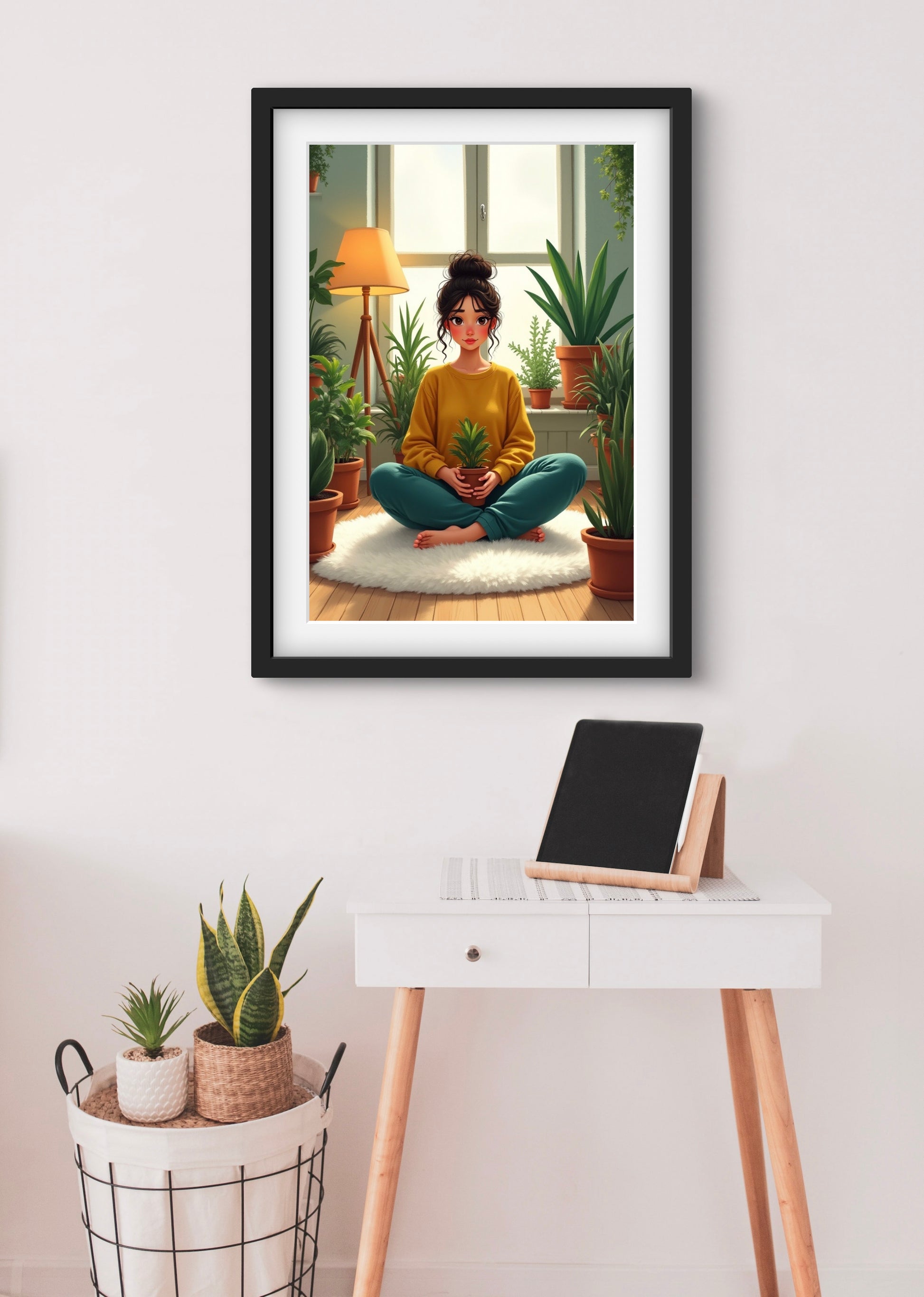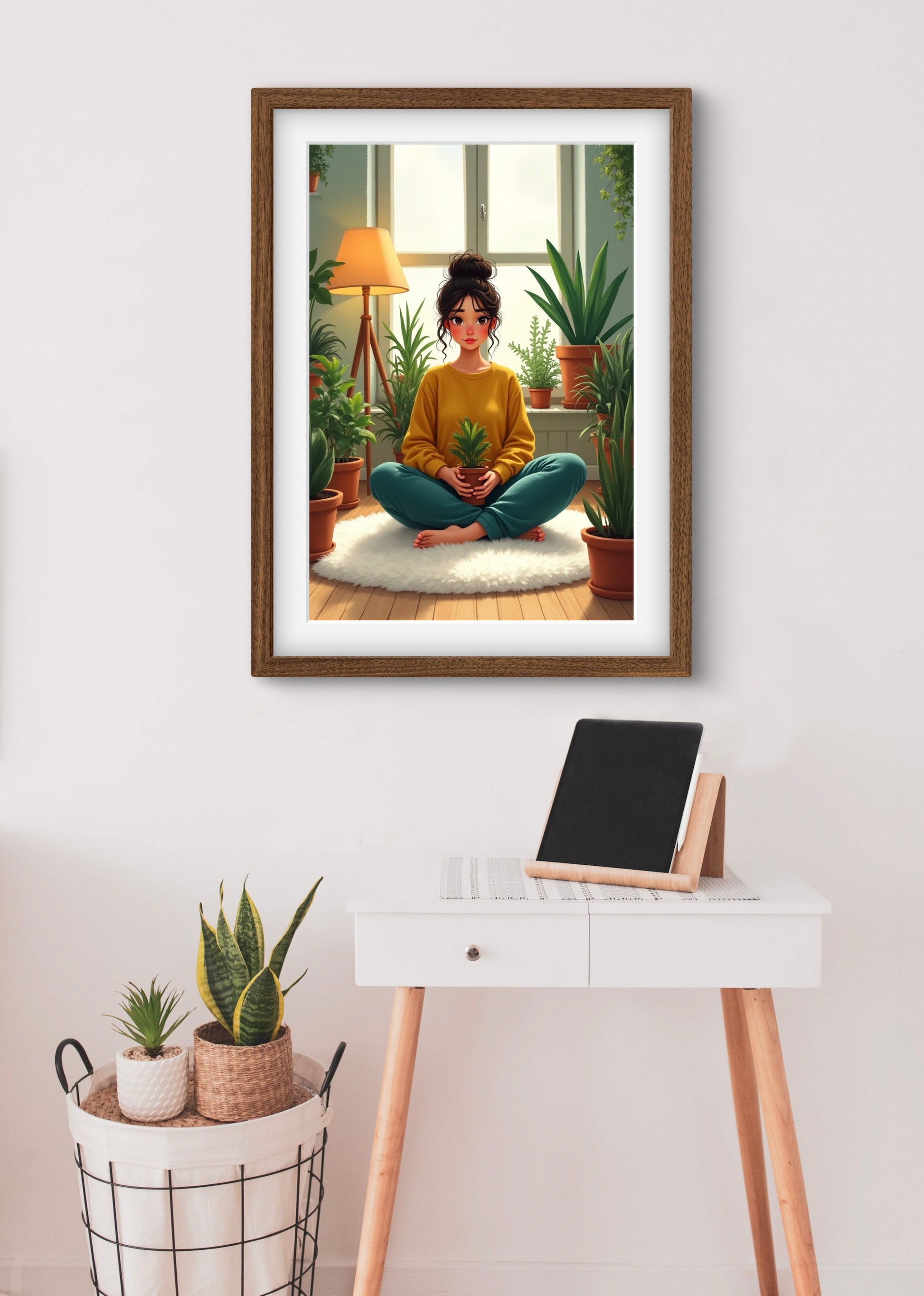 A celebration of stillness, greenery, and gentle connection. Green Companion captures a serene moment — a young woman sitting cross-legged on a soft white rug, cradling a potted plant in her hands. Framed by a sunlit room filled with lush houseplants and warm earthy tones, this artwork invites calm, growth, and grounded energy into your space.