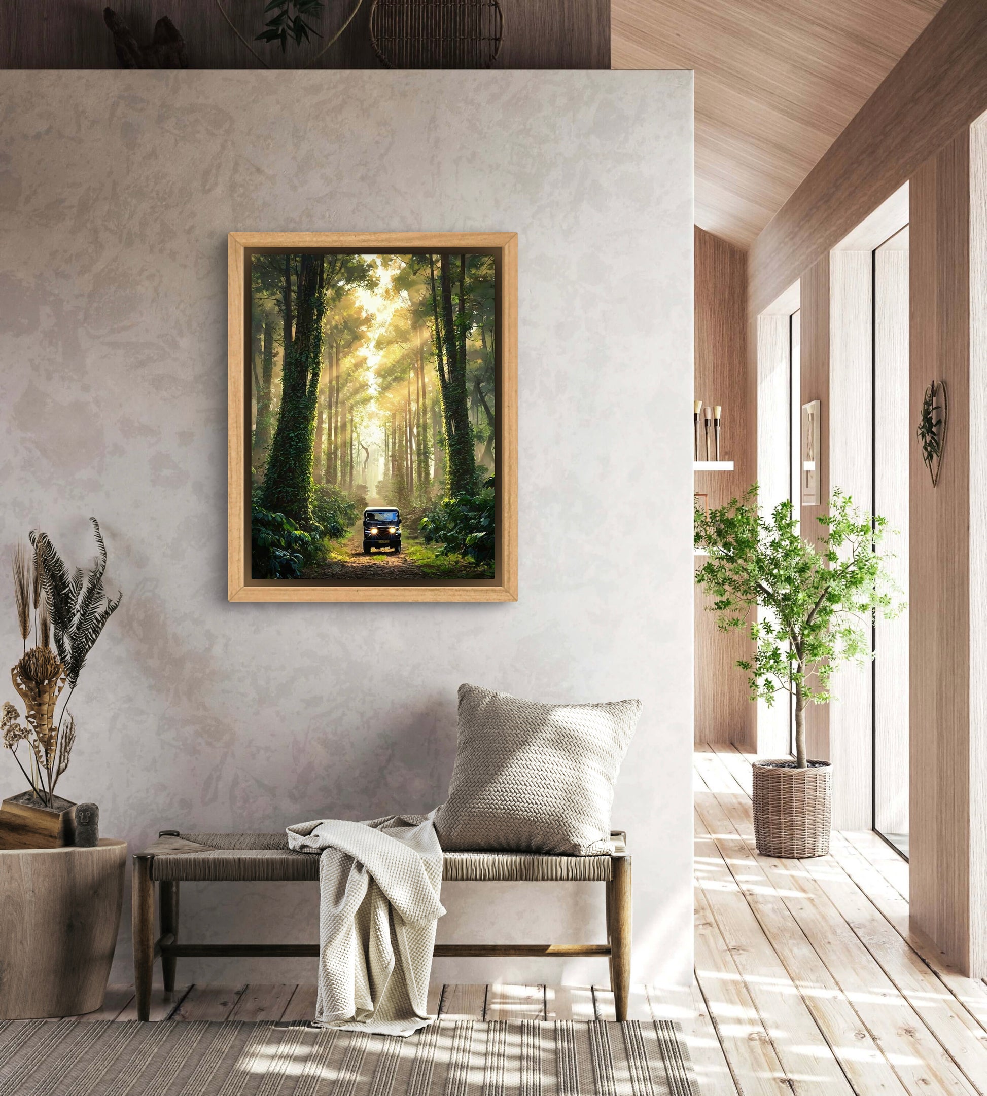 Into the Canopy captures a timeless moment of stillness and adventure — a lone jeep navigating a lush forest path as morning light filters through tall trees. Drenched in dappled golden sun and rich green foliage, this artwork invites you into the serene mystery of nature’s cathedral.