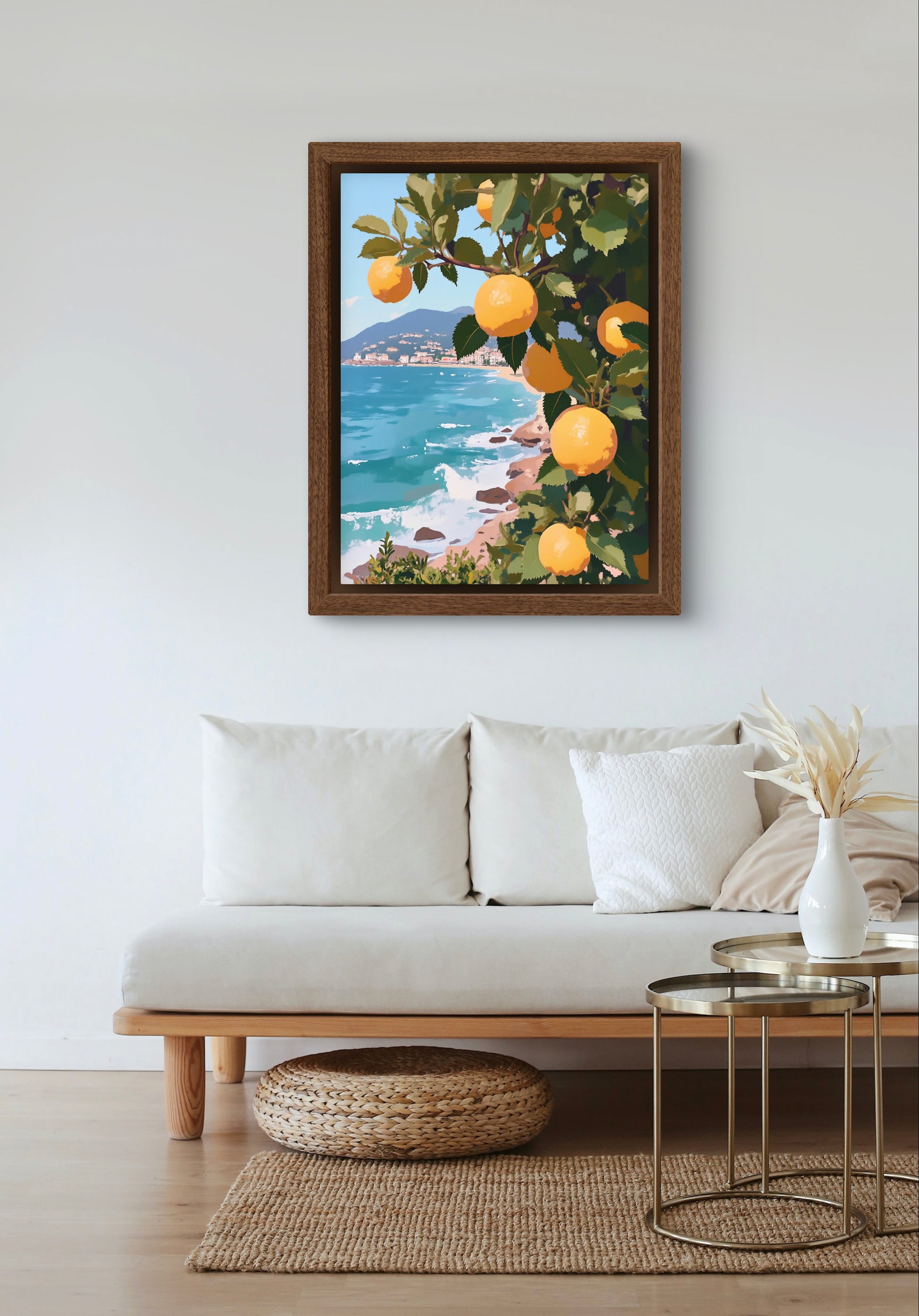 Bring home the sun-soaked charm of the Mediterranean with Lemon Grove by the Sea, a vivid wall art print that captures golden citrus fruit overlooking a dreamy coastal town. Inspired by Italy’s Amalfi Coast, this artwork blends the refreshing zest of lemons with the tranquil blues of the ocean—perfect for adding color and warmth to your space.