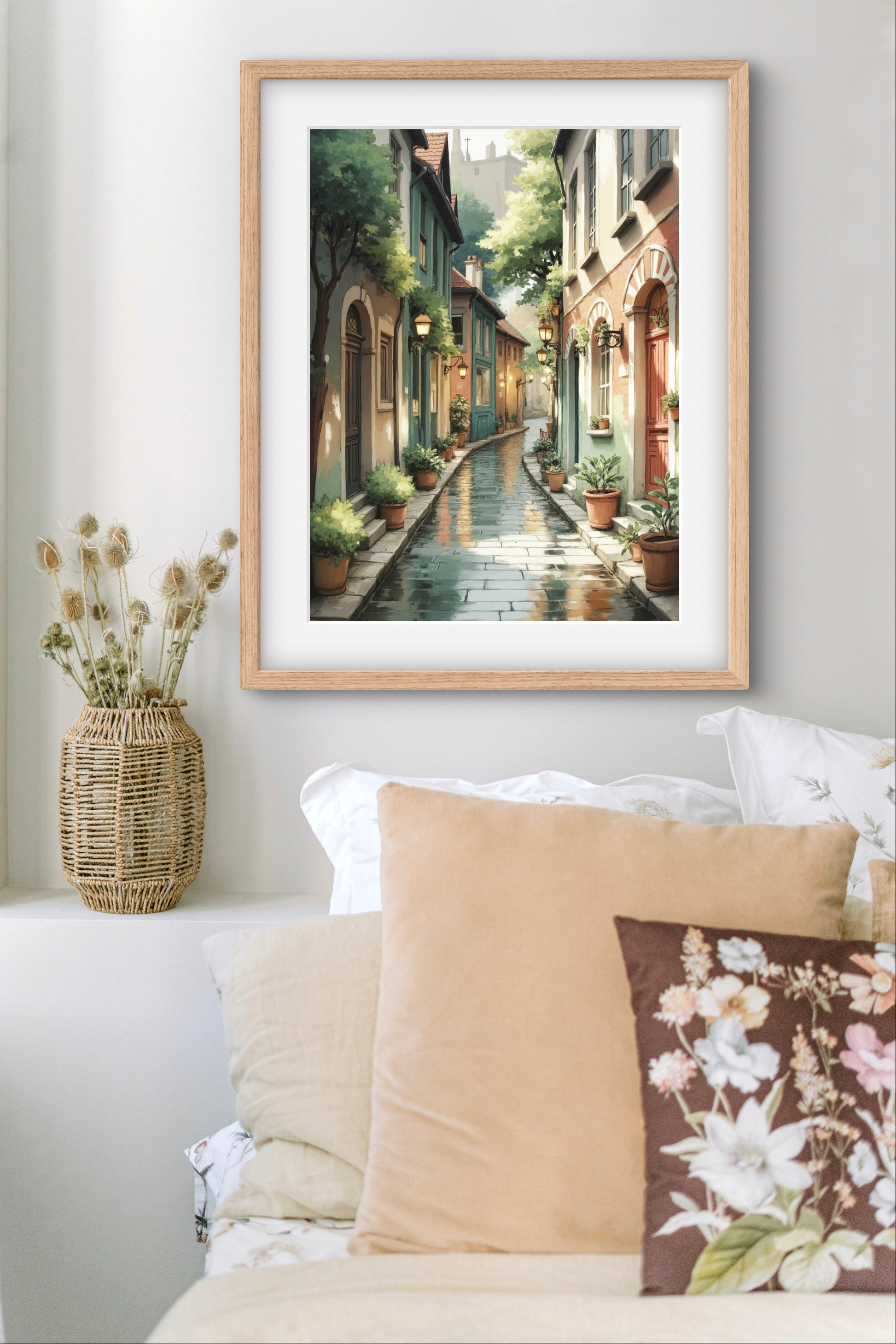 Rain-Kissed Alley – European Street Wall Art Print | Cozy Urban Decor for Living Room or Hallway