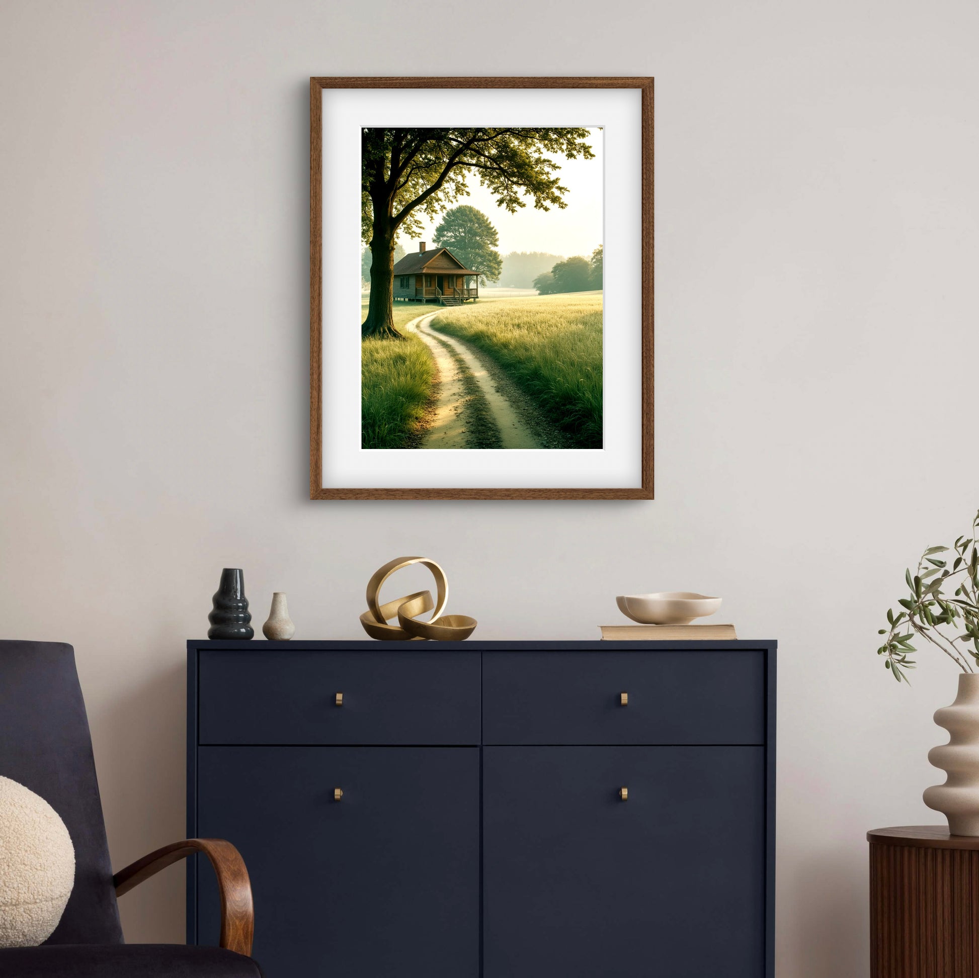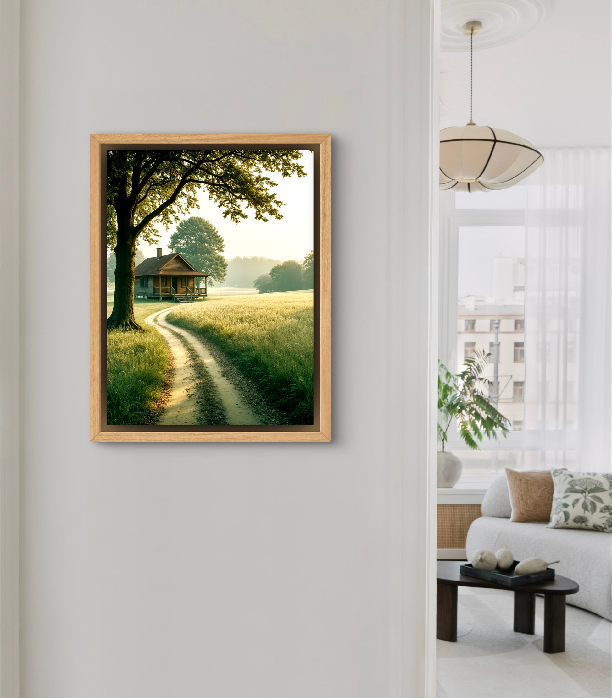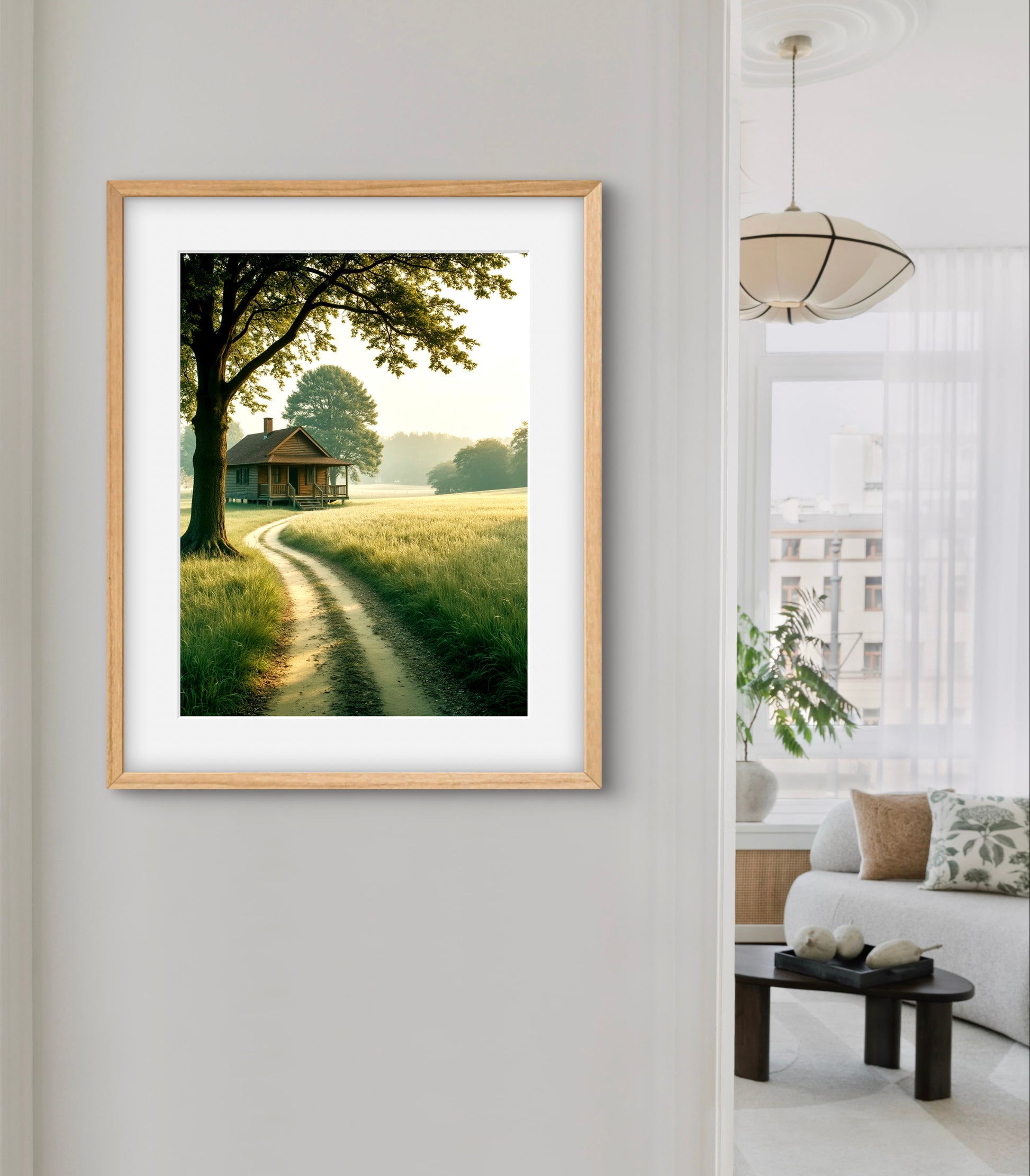 Welcome the warmth of rural simplicity into your space with Rustic Morning Cabin, a stunning wall art print featuring a cozy wooden cabin nestled in golden fields under a soft sunrise. A winding dirt path leads the viewer into a quiet world of peace and stillness, embraced by tall trees and natural light.
