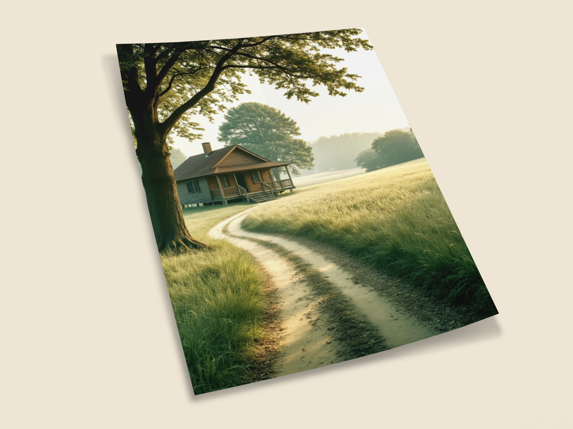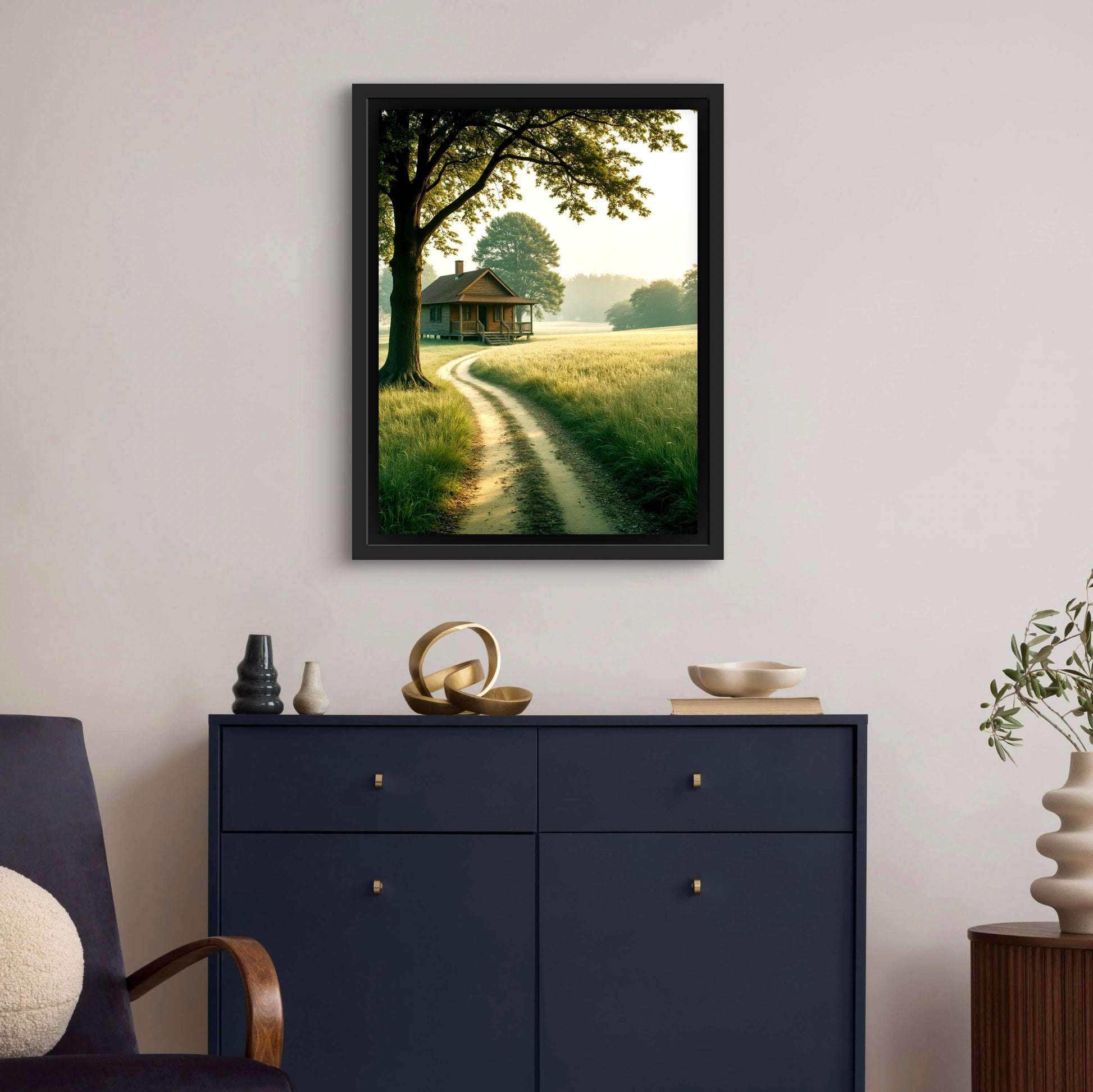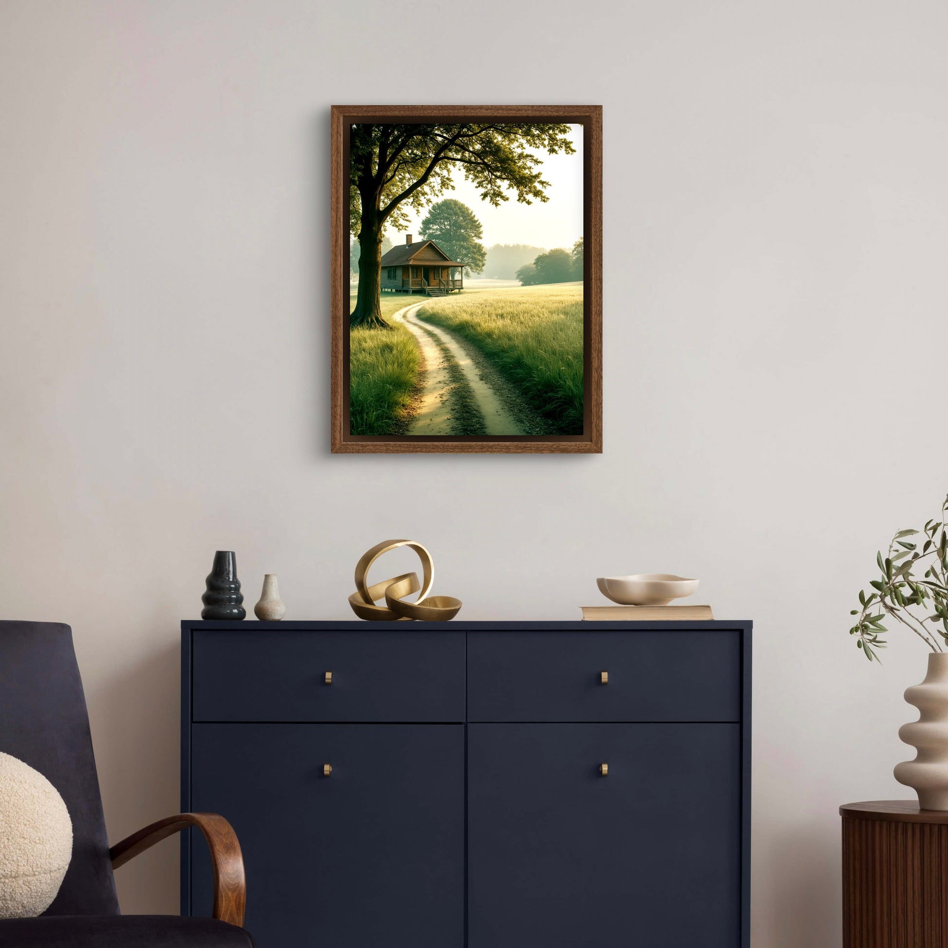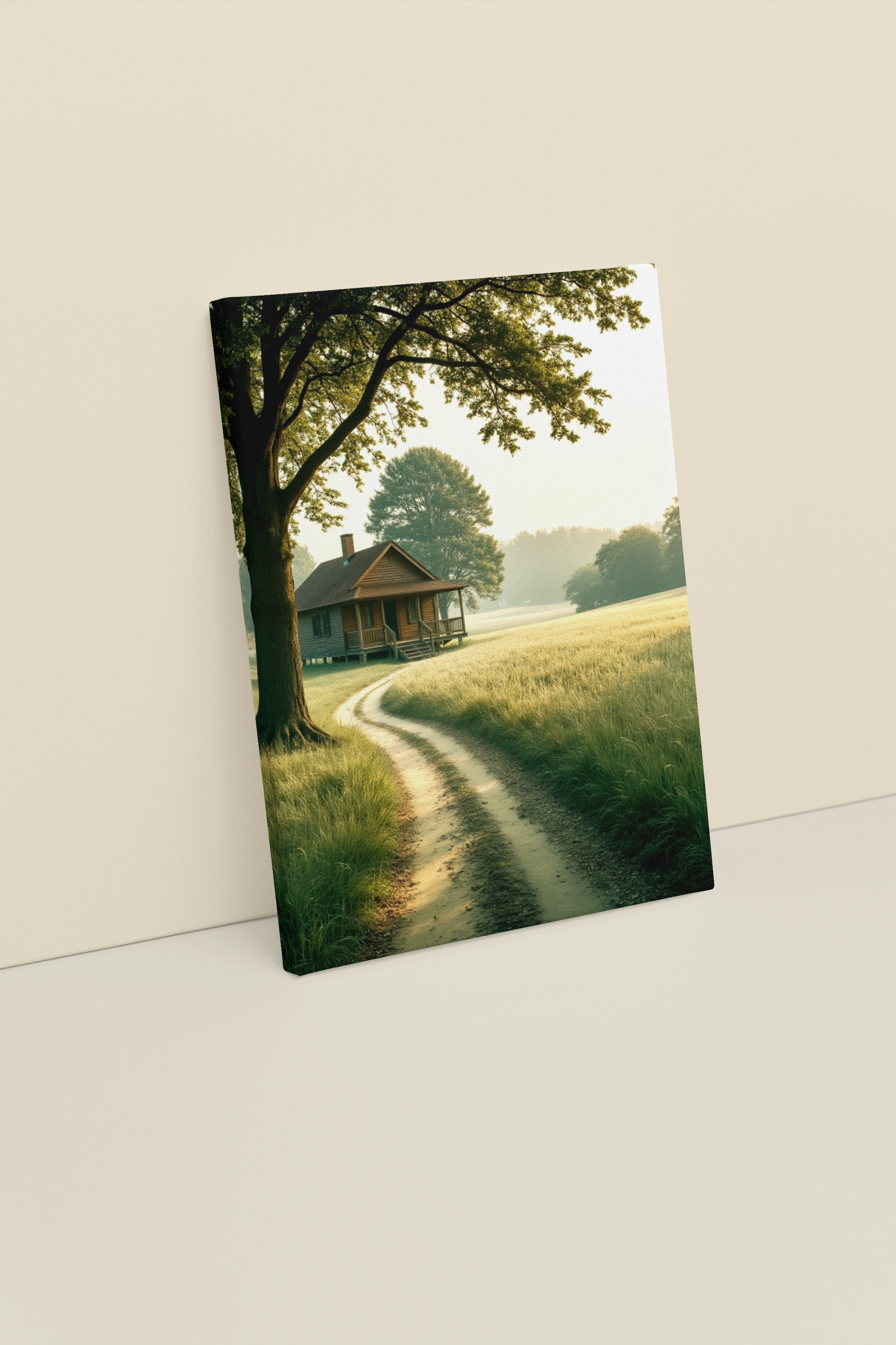 Welcome the warmth of rural simplicity into your space with Rustic Morning Cabin, a stunning wall art print featuring a cozy wooden cabin nestled in golden fields under a soft sunrise. A winding dirt path leads the viewer into a quiet world of peace and stillness, embraced by tall trees and natural light.