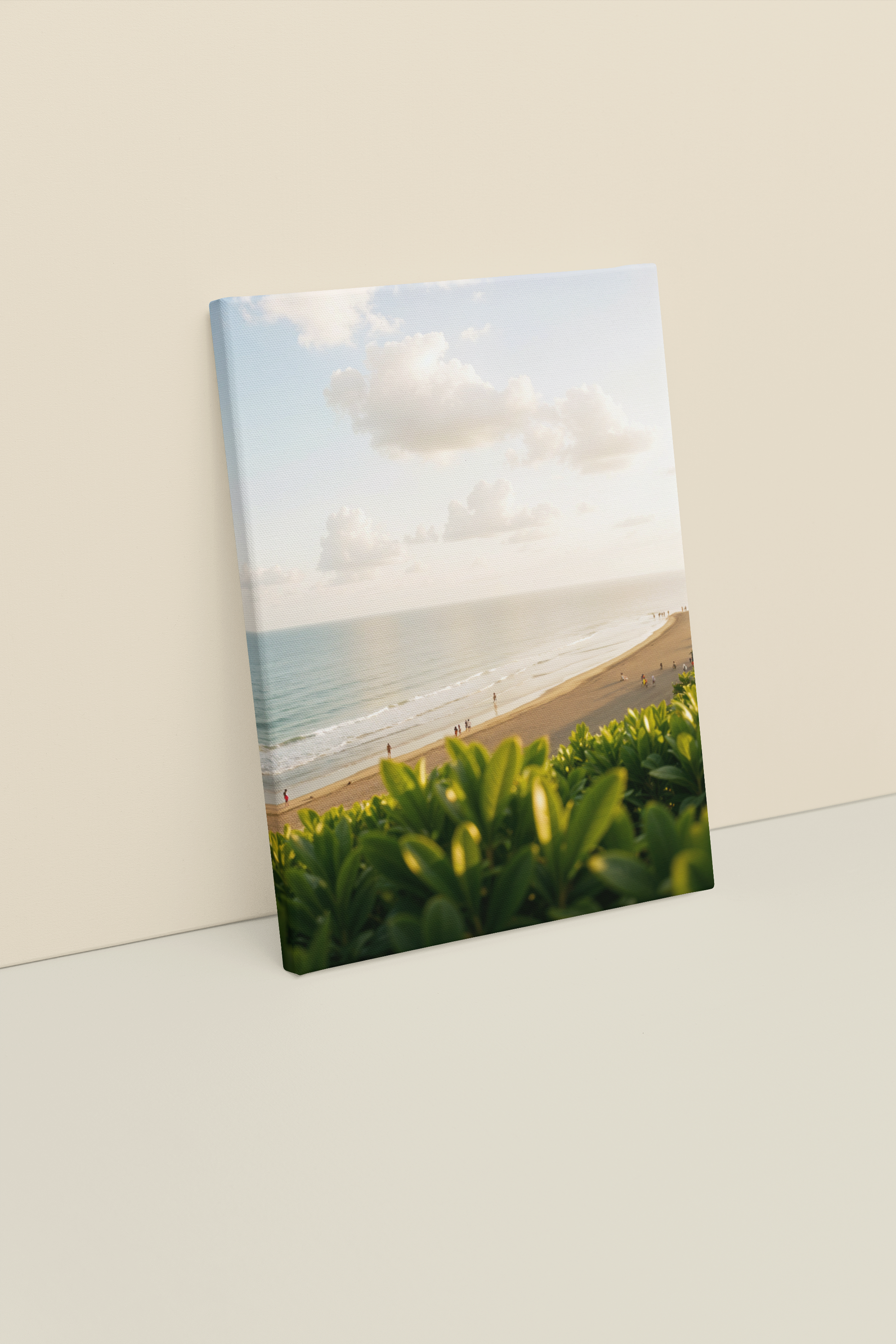 Step into a moment of quiet serenity with Golden Shoreline Calm, a minimalist beach wall art print that captures the gentle glow of the golden hour along a peaceful shoreline. With soft clouds floating above the calm ocean and distant figures strolling along the sand, this artwork brings a sense of stillness, space, and quiet joy to any room.
