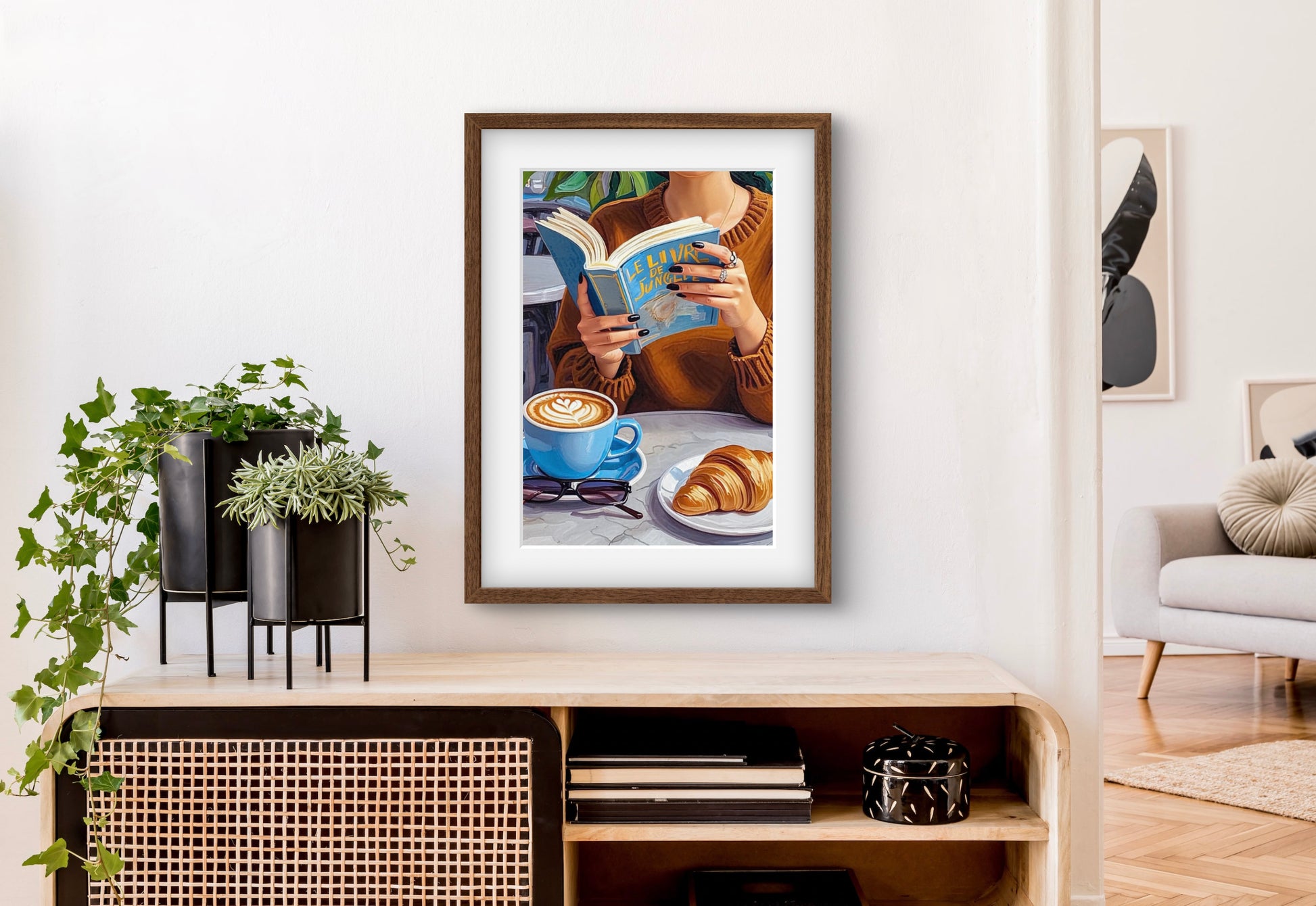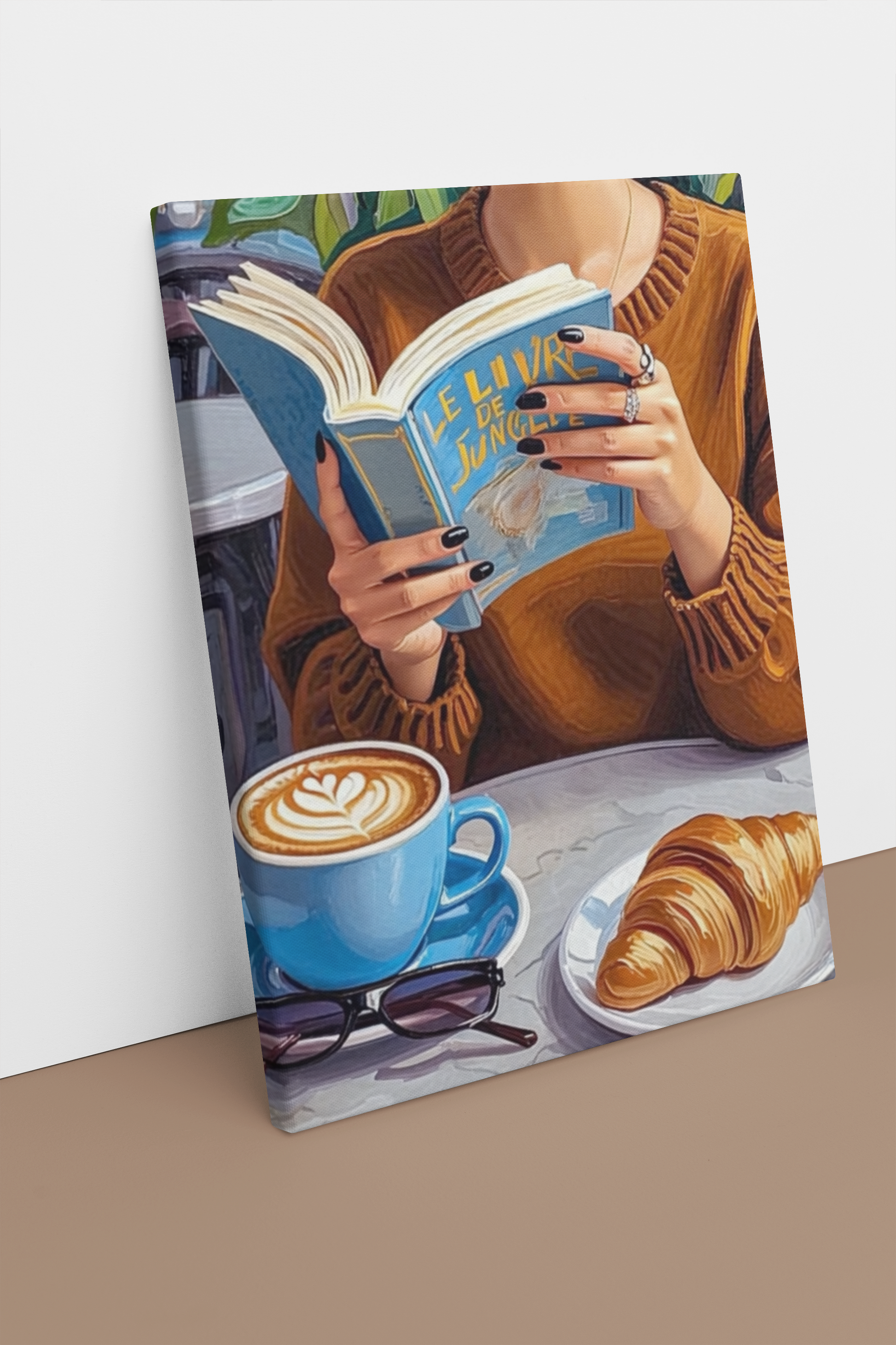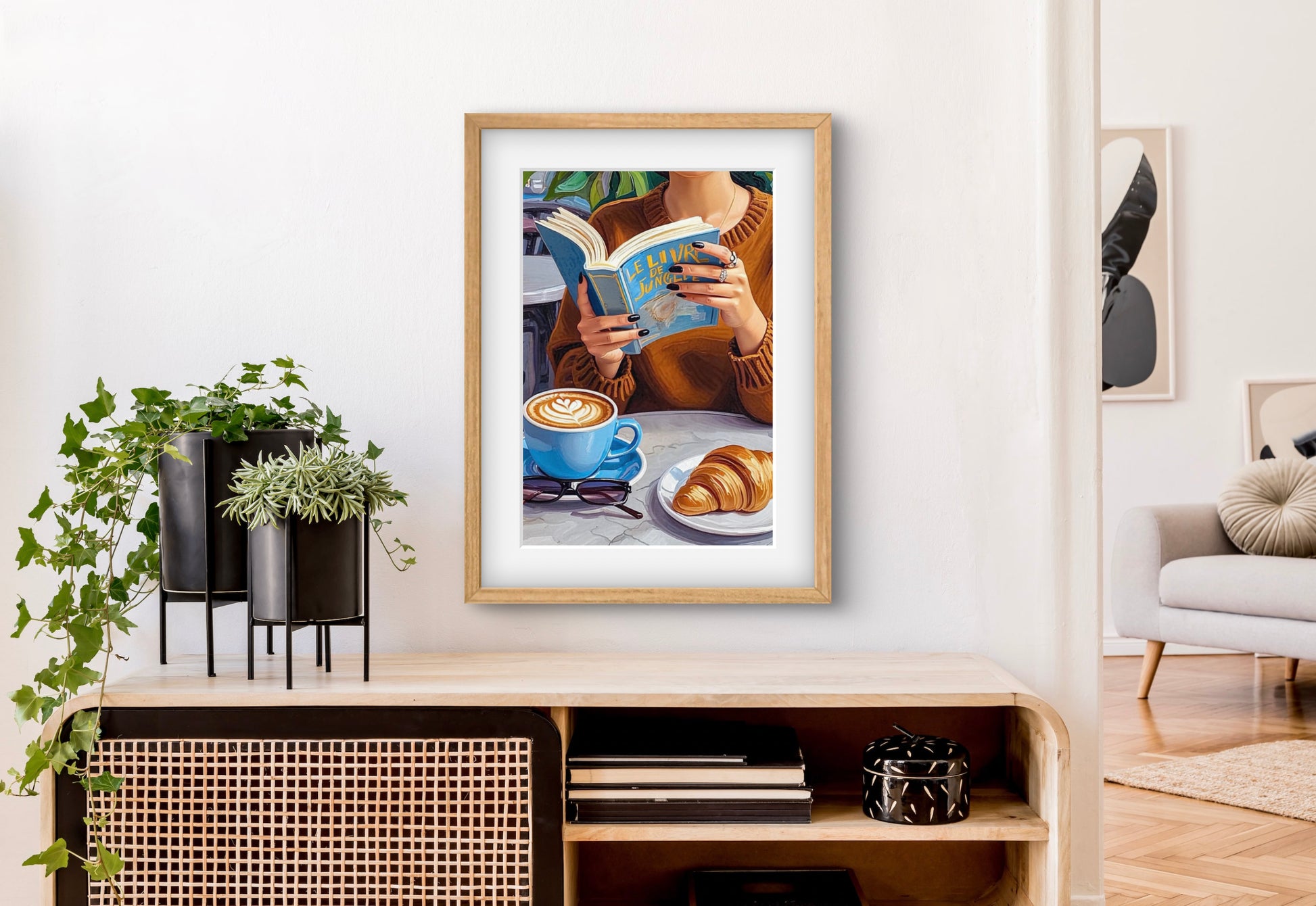 Step into a moment of quiet escape with The Table for One— a warm, modern portrait capturing the beauty of stillness in a bustling world. A woman, lost in a beloved classic as latte art steams beside her croissant. Styled with thoughtful details — black-polished nails, a soft brown sweater, marble table, and sunlit café backdrop — this piece beautifully captures the essence of solitude, style, and everyday luxury.