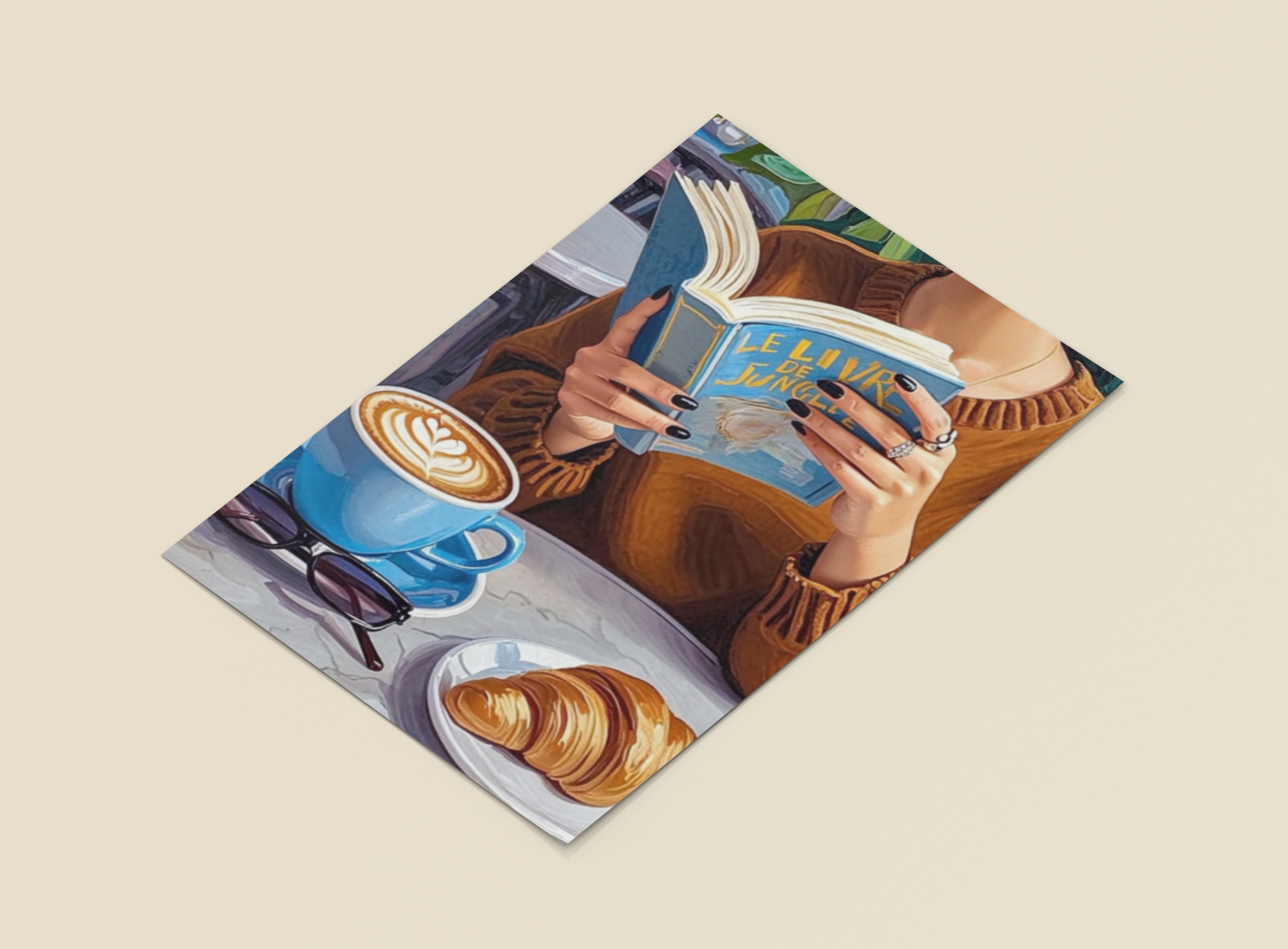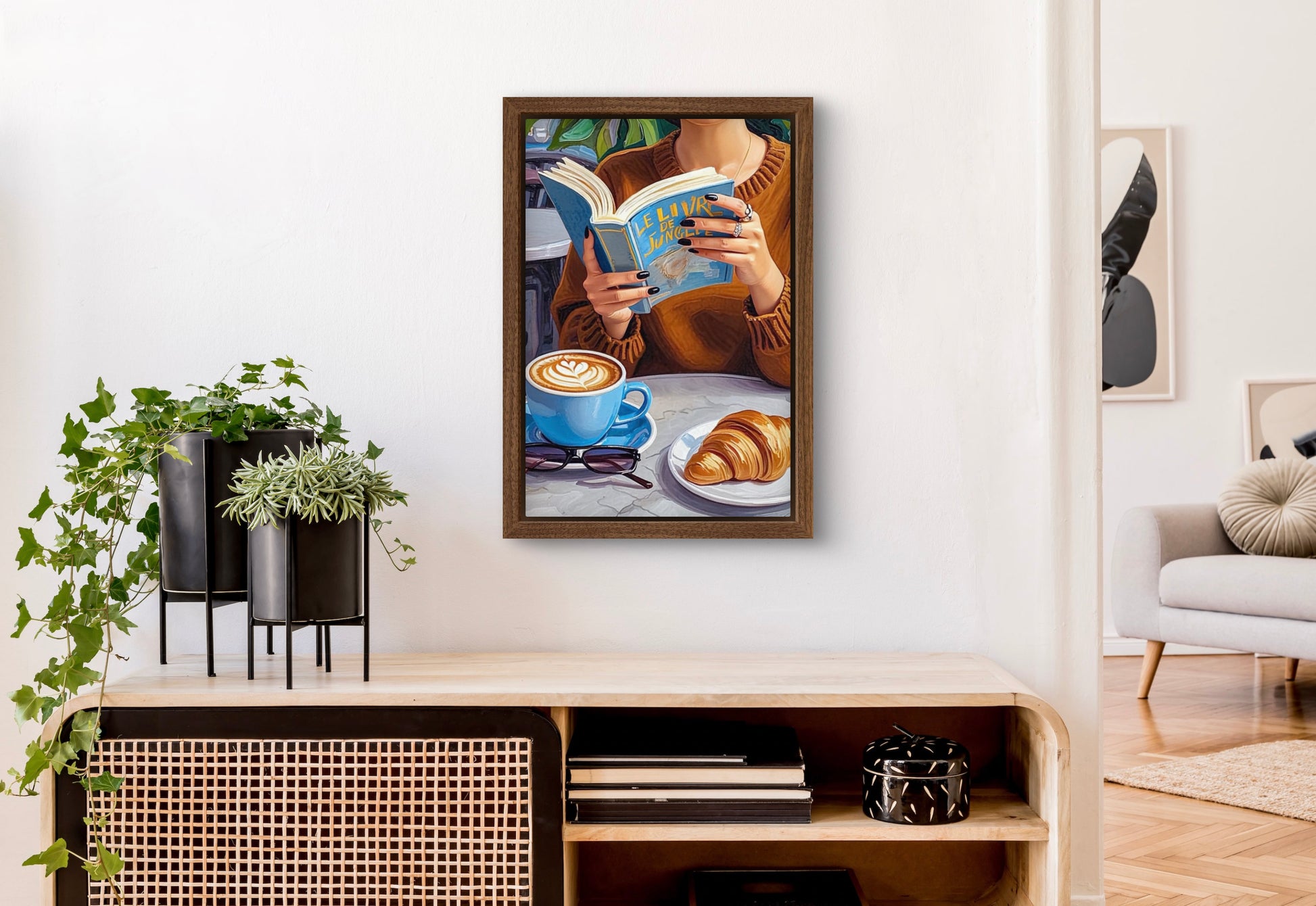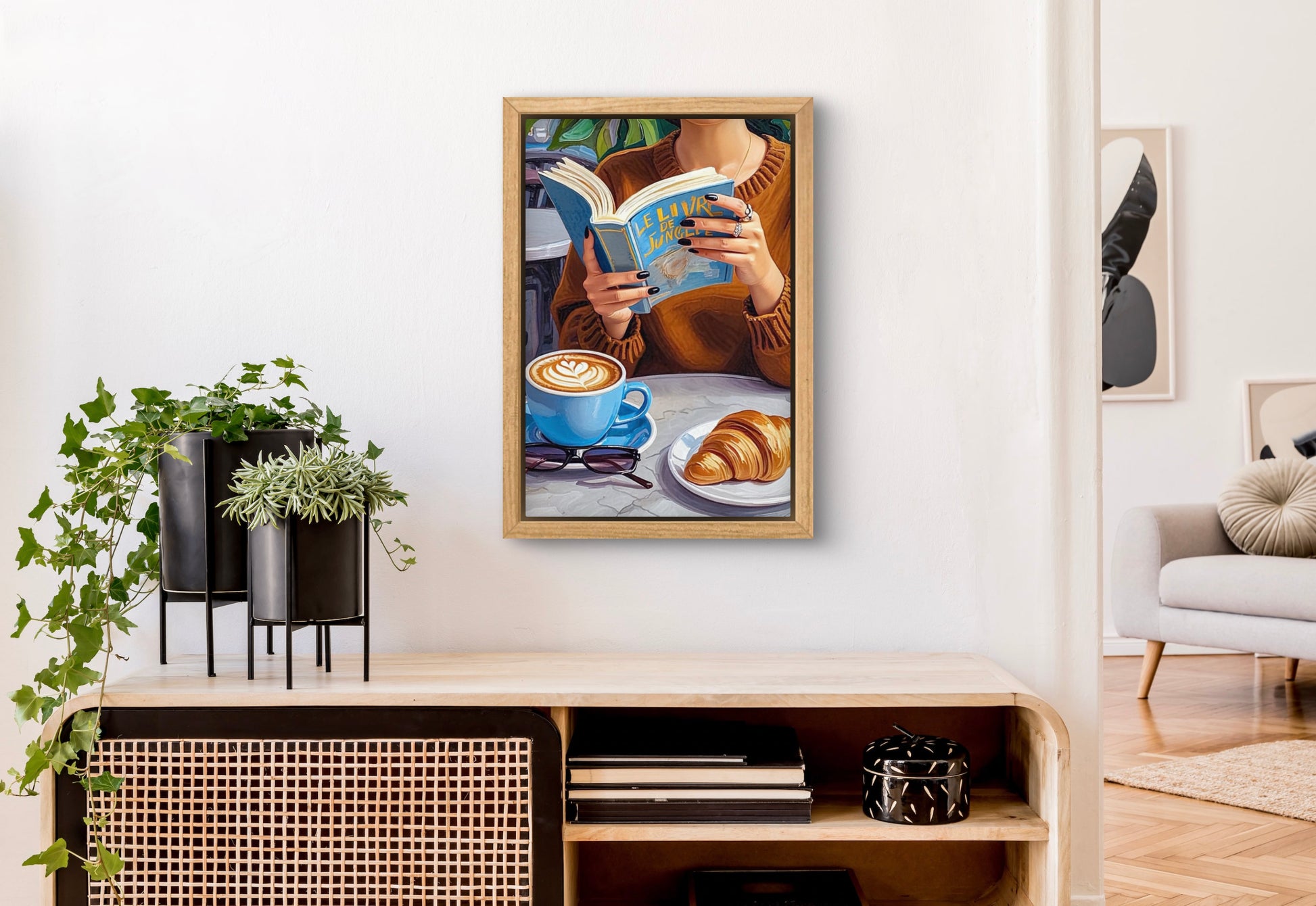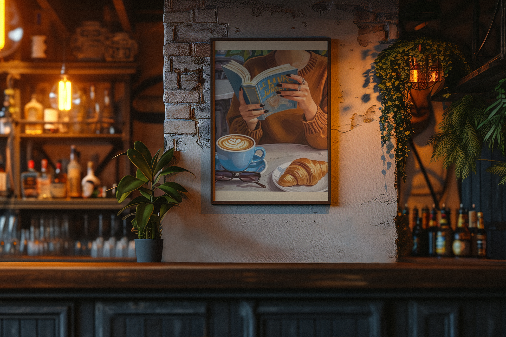 Step into a moment of quiet escape with The Table for One— a warm, modern portrait capturing the beauty of stillness in a bustling world. A woman, lost in a beloved classic as latte art steams beside her croissant. Styled with thoughtful details — black-polished nails, a soft brown sweater, marble table, and sunlit café backdrop — this piece beautifully captures the essence of solitude, style, and everyday luxury.